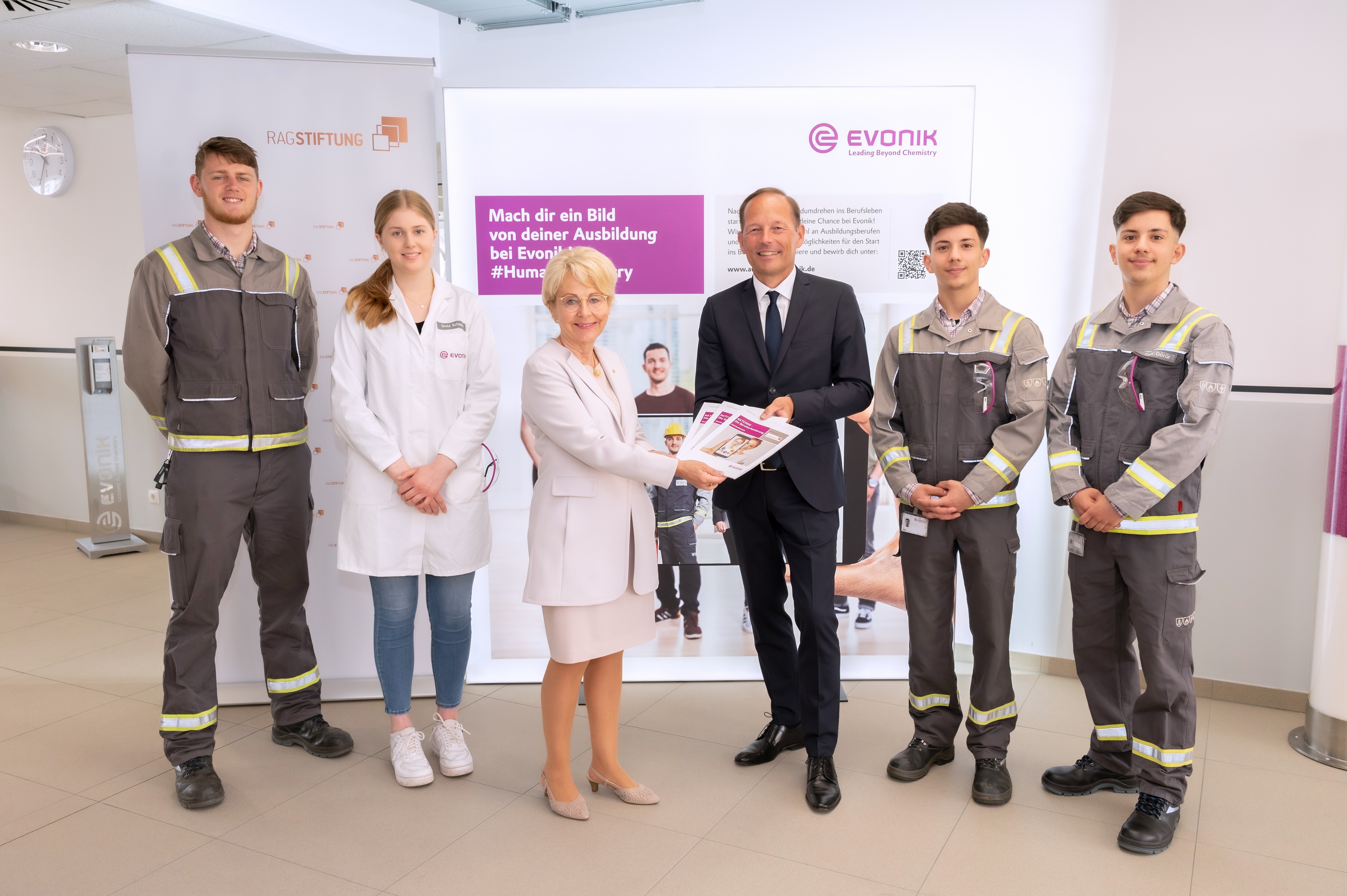 Bild 2: Freuen sich über den Erfolg von "MATCHING - Die Berufsorientierung" (v.l.n.r.): Thomas Wessel (Personalvorstand und Arbeitsdirektor von Evonik), Bärbel Bergerhoff-Wodopia (Mitglied im Vorstand der RAG-Stiftung) und Greta Schoppen (Auszubildende) bei Evonik im Chemiepark Marl. Foto: Dirk Bannert/Evonik