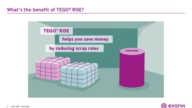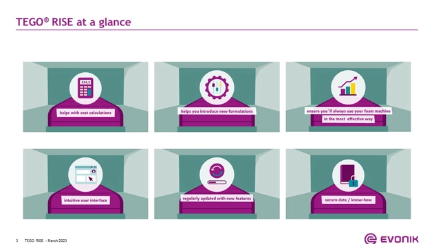 Evonik hat mit TEGO® RISE eine Software entwickelt, die Schaumstoffherstellern dabei hilft, ihre Produktionsprozesse wirtschaftlicher, schneller und umweltfreundlicher zu gestalten. Die Software ermöglicht es, die optimalen Parameter für den Produktionsprozess von Polyurethan-Weichschaumstoffen im Vorfeld am Computer zu simulieren und einzustellen. Dadurch können Hersteller von Schaumstoffblöcken die Abfallmenge bei der Produktion deutlich reduzieren.