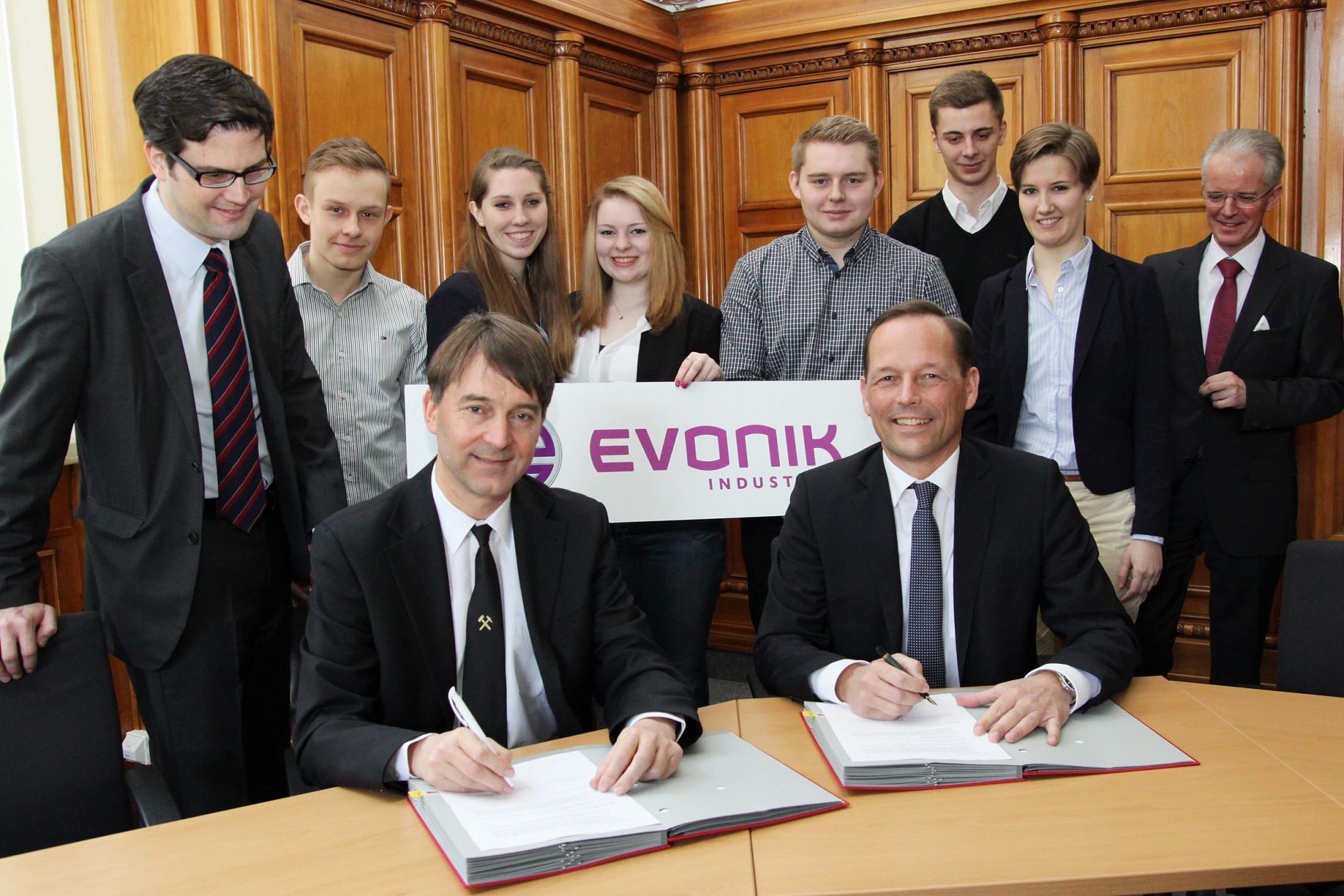 Prof. Dr. Jürgen Kretschmann und Thomas Wessel, Personalvorstand und Arbeitsdirektor der Evonik Industries AG, den offiziellen Kooperationsvertrag.
