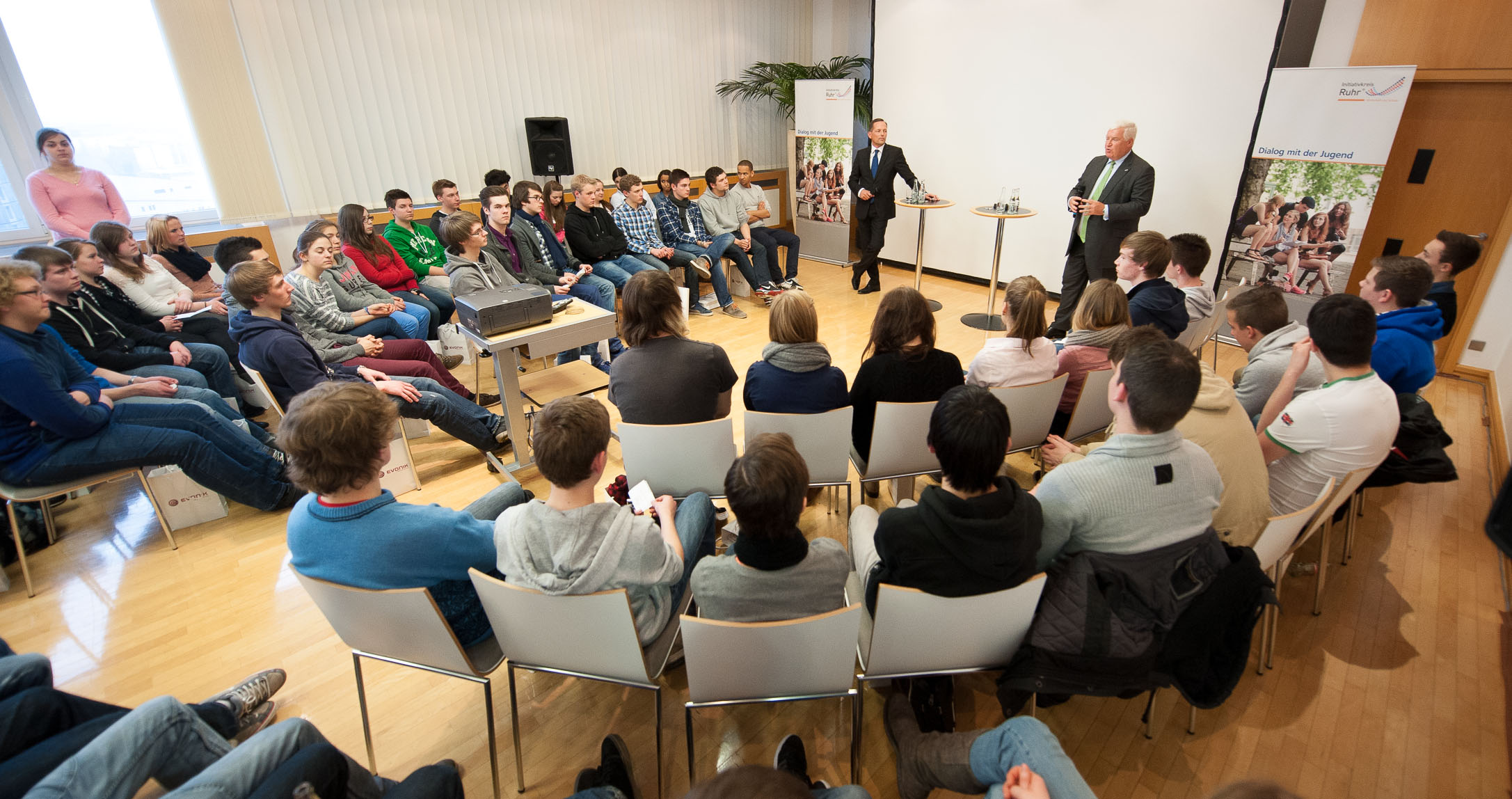 Rund 4000 Schülerinnen und Schüler von rund 50 verschiedenen Gymnasien und Gesamtschulen der Metropole Ruhr haben sich 2012/13 für die Veranstaltungsreihe "Dialog mit der Jugend" angemeldet. Mit diesen Gesprächen führt der Initiativkreis Ruhr Oberstufenschüler zum 16. Mal aktiv an Wirtschaftsthemen heran. Das Prinzip: Top-Manager der Initiativkreis-Ruhr-Unternehmen stehen den Schülern an einem Nachmittag Rede und Antwort. Im laufenden Schuljahr finden 60 solcher Begegnungstermine statt.