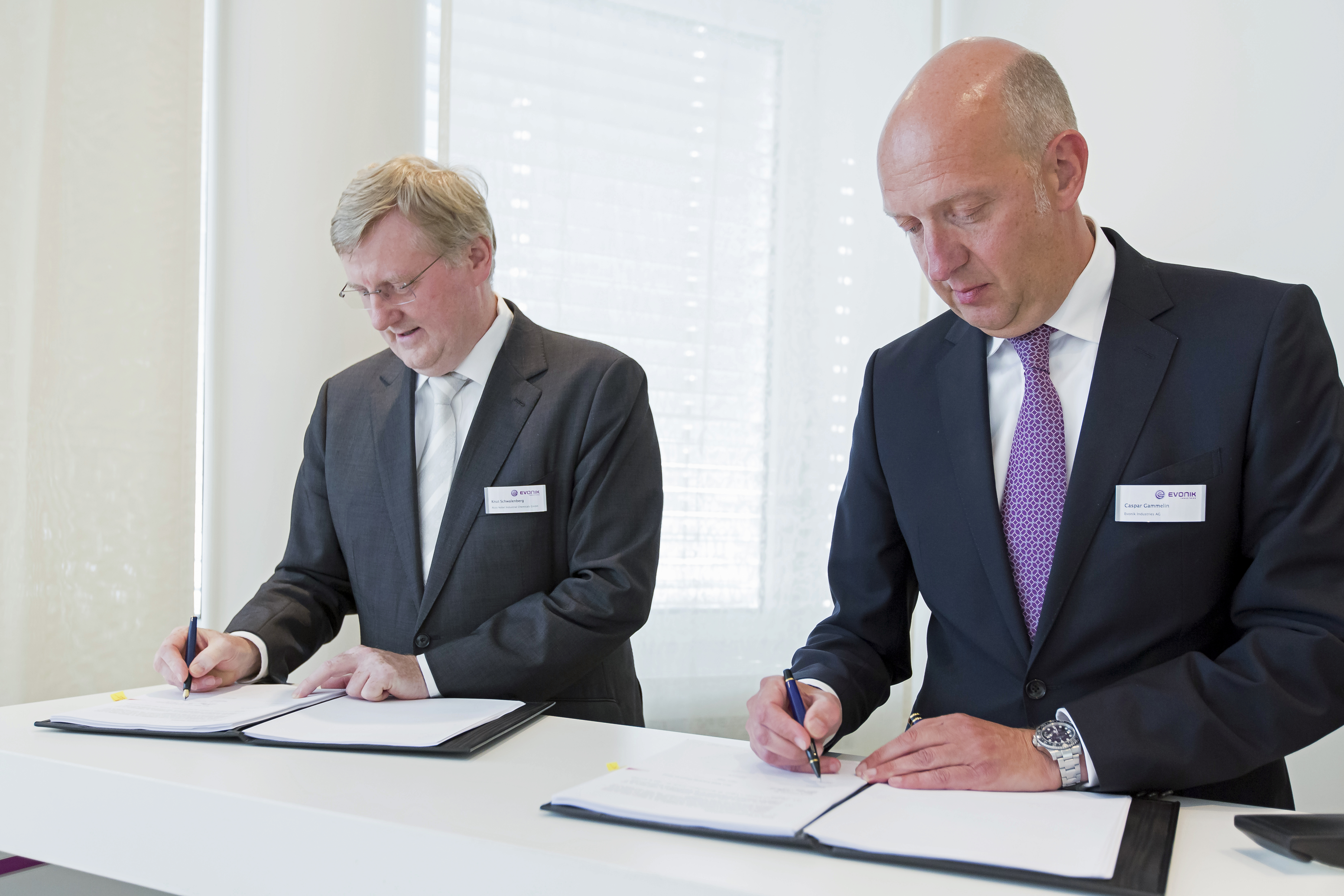 Essen, 16. Juni 2015. Evonik Industries und AkzoNobel gründen ein gemeinsames Joint Venture. Ziel des neuen Unternehmens, an dem Evonik und AkzoNobel mit jeweils 50 Prozent beteiligt sind, ist der Neubau und gemeinsame Betrieb einer Membranelektrolyse für Kalilauge und Chlor am AkzoNobel-Standort Ibbenbüren.