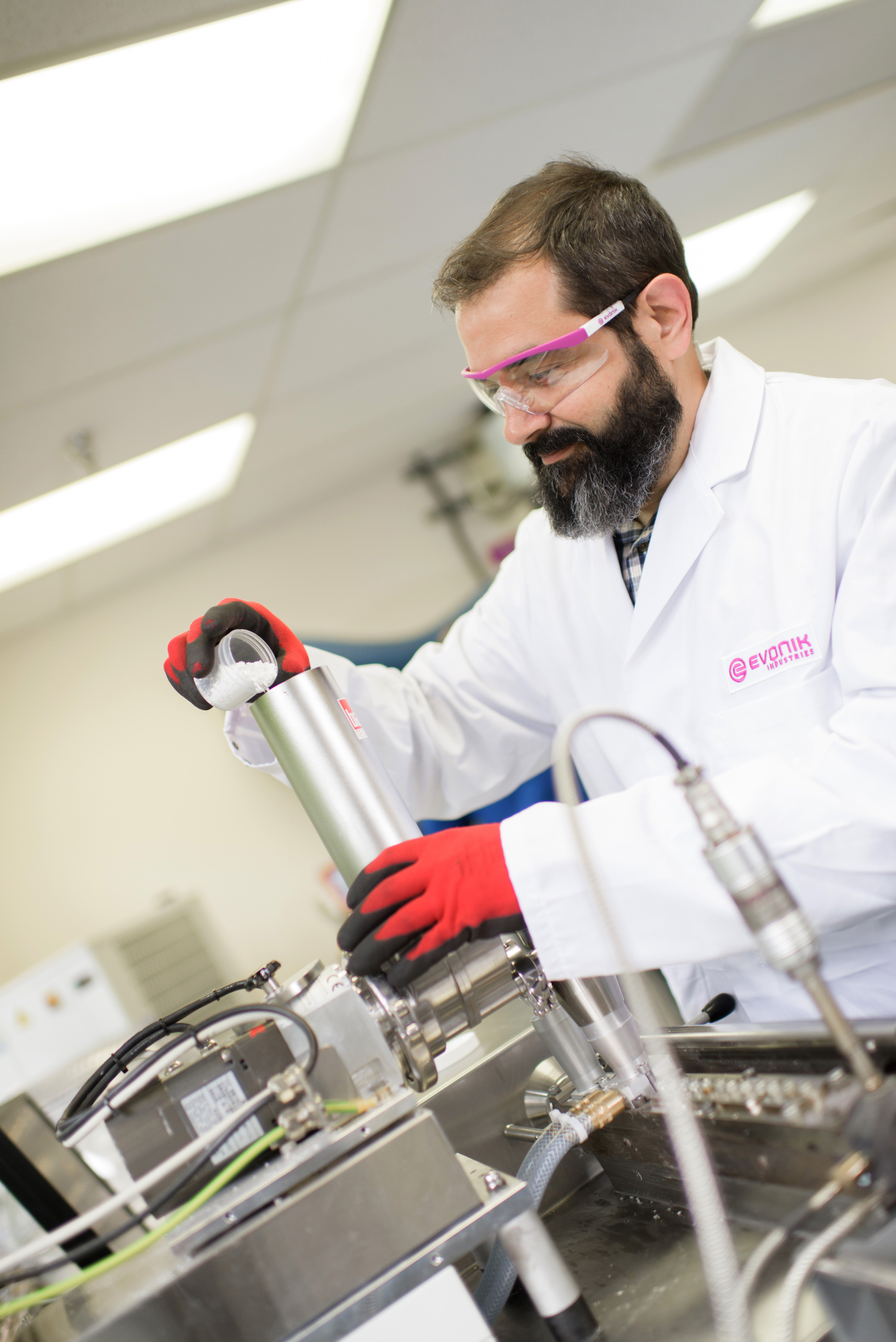 Bild 3: Im Kompetenzzentrum Medical Devices in Birmingham (Alabama, USA) forscht Evonik an verbesserten Materialien für die Medizintechnik. Hier ein Mitarbeiter beim Befüllen eines Extruders mit Polymergranulat.