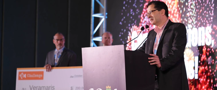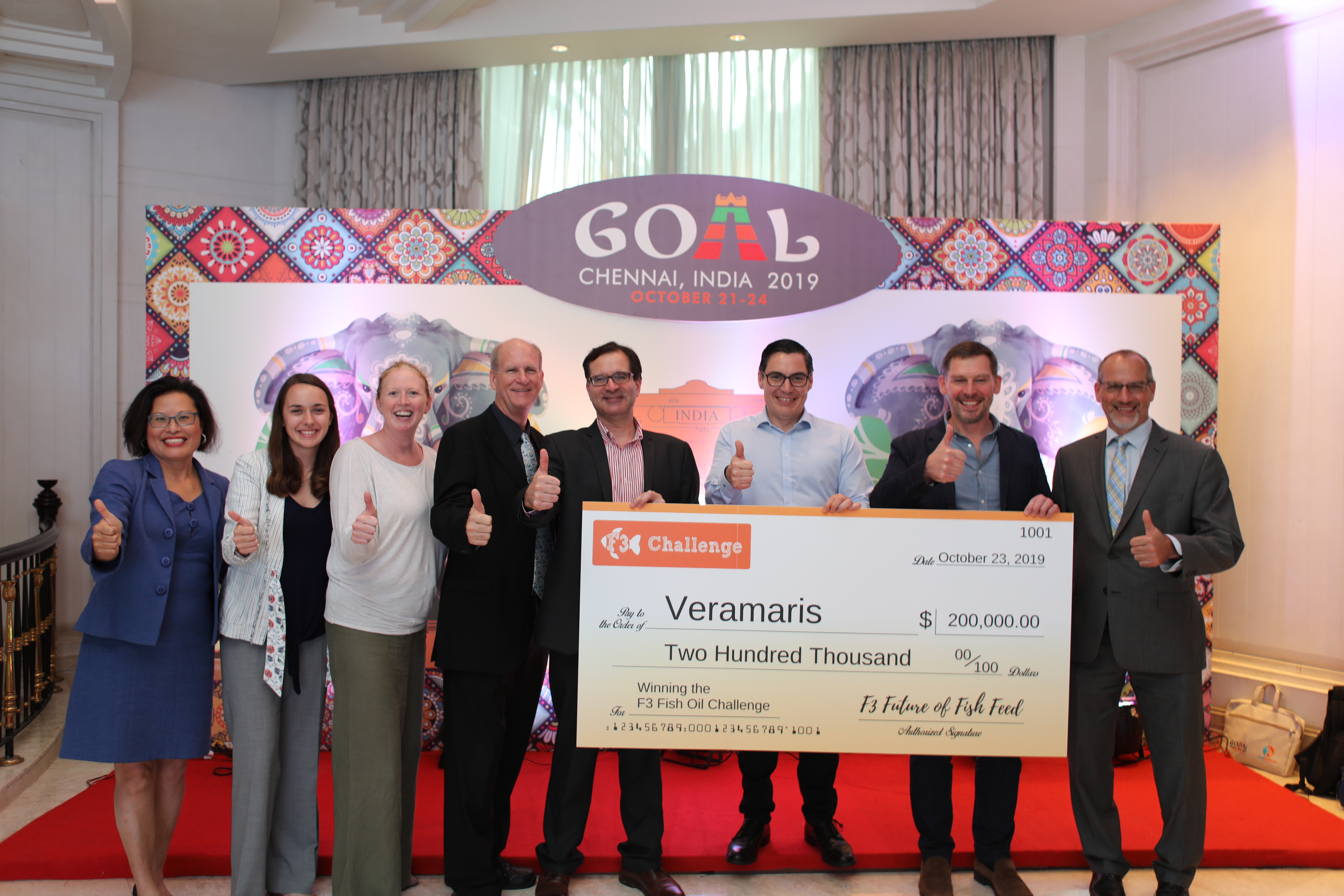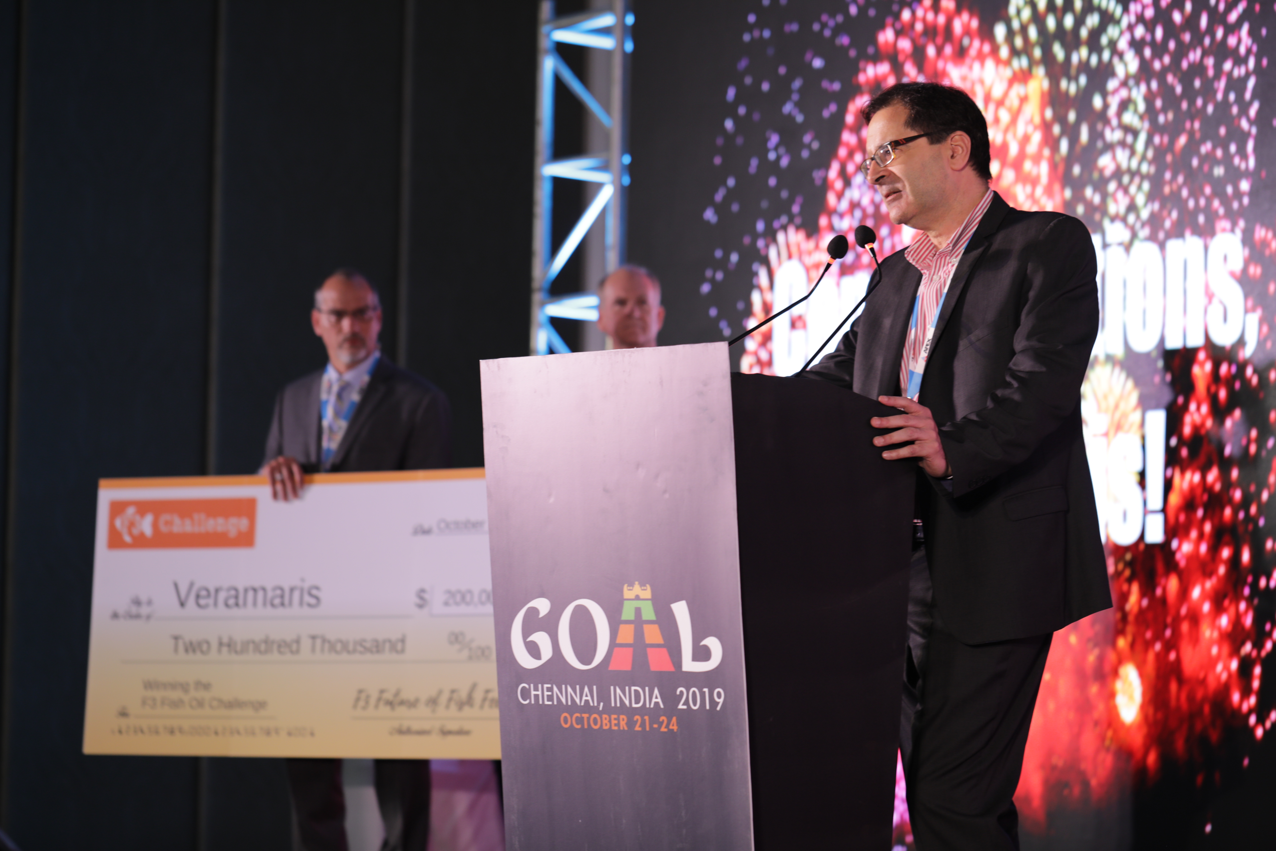 Die Auszeichnung für den Gewinn der „F3 Fish Oil Challenge“ wurde Karim Kurmaly, Geschäftsführer von Veramaris, während der GOAL-Konferenz der Global Aquaculture Alliance am 23. Oktober 2019 in Chennai, Indien, verliehen.