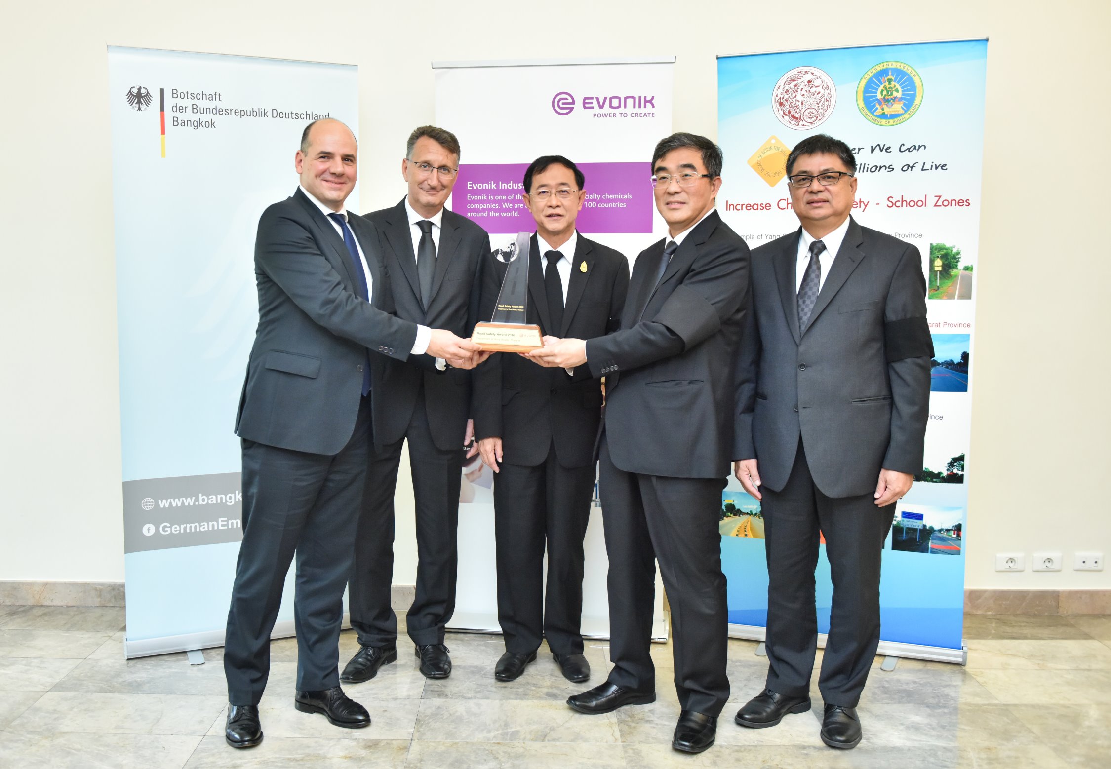 Der "Evonik Road Safety Award" wurde in diesem Jahr zum ersten Mal vergeben. Im Kontext seiner unternehmerischen und sozialen Verantwortung will Evonik damit weltweit nachhaltige Initiativen und Projekte zur Förderung der Verkehrssicherheit unterstützen. Evonik setzt sich für die soziale Entwicklung an seinen Standorten weltweit ein und fördert deshalb gemeinnützige Initiativen, durch die die Lebensqualität verbessert wird. Der deutsche Botschafter S.E. Rolf Schulze, Dr. Florian Kirschner, Country Head von Evonik Thailand, und Jochen Henkels, Business Director von Evonik Road Marking, übergaben dem DRR die Auszeichnung für sein Infrastrukturprojekt "Increase Children Safety – School Zones" (Mehr Sicherheit für Kinder – Schulzonen). Mit dem Preis würdigte Evonik den Beitrag des Amtes zur Verbesserung der Verkehrssicherheit in 3.000 Schulzonen in den ländlichen Gebieten Thailands.