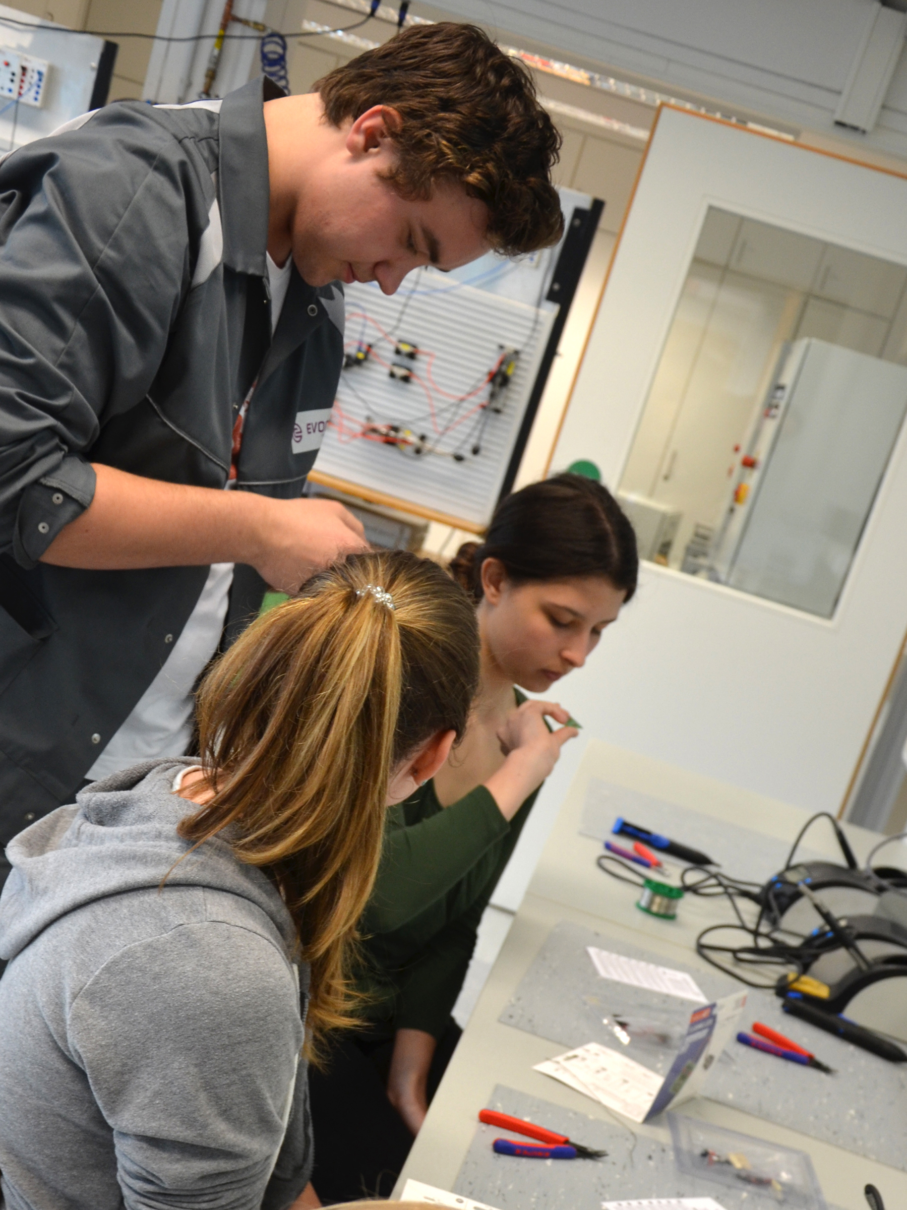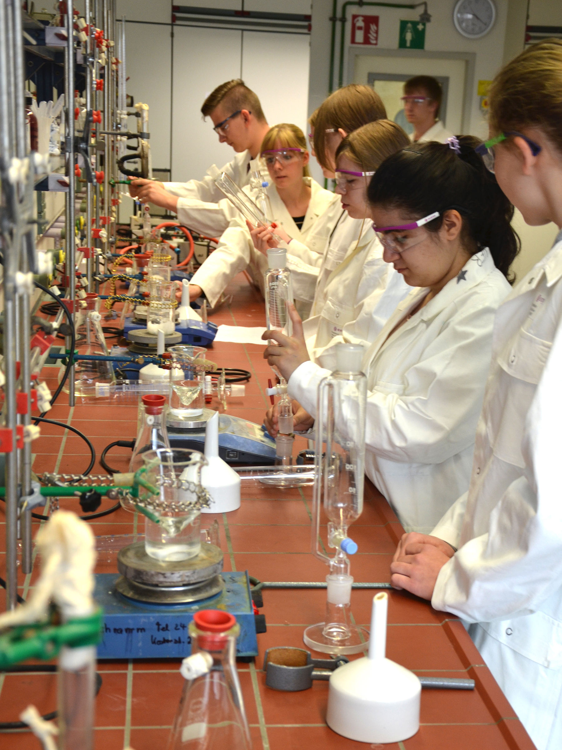 Im Laborkittel oder Blaumann ging es in die Werkstätten, ins Chemielabor oder ins Chemie-Technikum, wo die Schülerinnen nach Herzenslust experimentieren oder werkeln konnten – natürlich unter fachkundiger Anleitung der Ausbilder und der Auszubildenden, die auch bei allgemeinen Fragen Rede und Antwort standen.