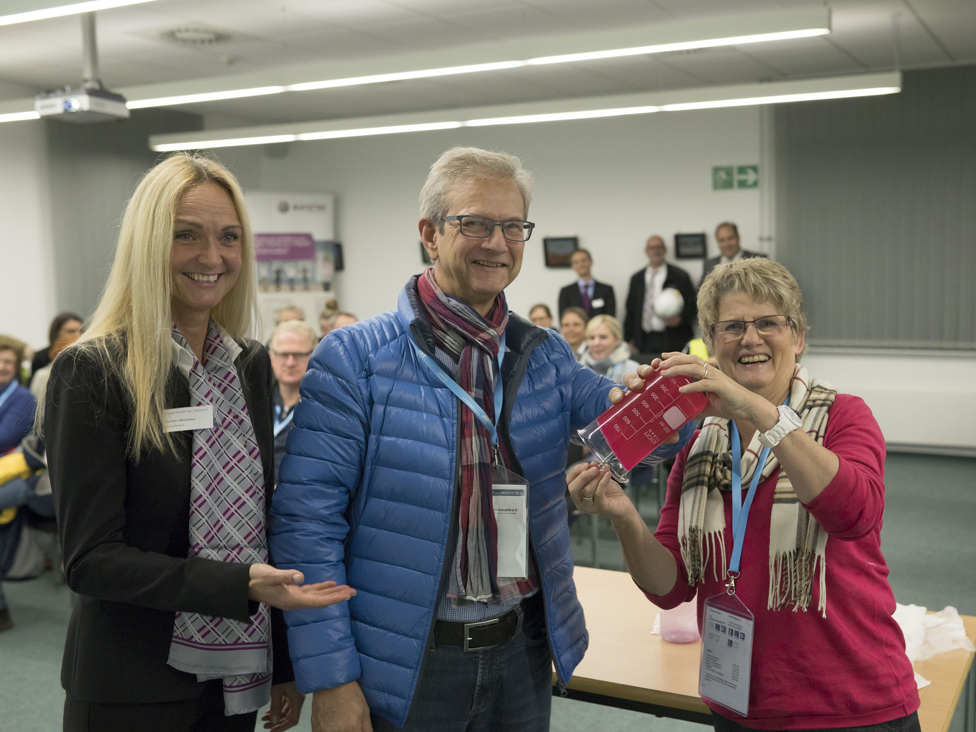 Evonik bot den Besuchern am 26. Oktober in einer besonderen Abend-Atmosphäre ein Programm mit viel Information und Unterhaltung. In Krefeld gehörten dazu ein kurzer Vortrag über Eckdaten des Standorts, Infos zu Ausbildungsangeboten und Rundgänge durch das Werk. Die Gäste konnten den Mitarbeitern in der Superabsorber-Produktion oder im Anwendungstechnik-Zentrum über die Schulter blicken und vor Ort Wissenswertes über die Superabsorber von Evonik erfahren. Mit den Produkten, die unter anderem in Babywindeln für trockene Babypopos sorgen, nimmt Evonik eine Spitzenposition auf dem Weltmarkt ein.