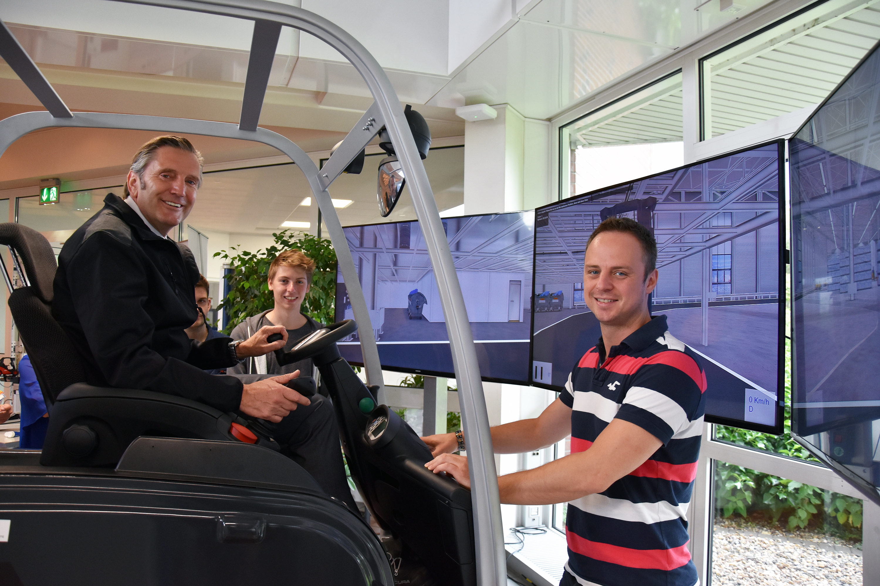 Überall dort, wo sich in einem Unternehmen Fahrzeuge und Fußgänger die Verkehrsflächen teilen, besteht eine erhöhte Unfallgefahr, zum Beispiel an Kreuzungen. Der Staplerfahrer kann nicht immer sehen, wer oder was hinter der nächsten Ecke auf ihn wartet oder ihm entgegenkommt. Deshalb heißt es an diesen Stellen, besonders umsichtig zu handeln. Auch Standortleiter Armin Reimann nahm am Simulatortraining teil und war erstaunt über die Wendigkeit des Staplers: „Wenn man ein solches Fahrzeug bewegt, muss man besonders vorsichtig sein, weil der leise Elektromotor vielleicht auch nicht immer von anderen Verkehrsteilnehmern sofort wahrgenommen wird. Aber auch Radfahrer und Fußgänger sollten stets aufmerksam sein und zur Sicherheit immer den Blickkontakt zum anderen Verkehrsteilnehmer suchen.“ Selbst das Klingeln der Radfahrer können Staplerfahrer möglicherweise überhören. Deshalb sollten Radfahrer und Fußgänger immer erst das Fahrzeug passieren, wenn der Fahrer auf sie aufmerksam geworden ist.