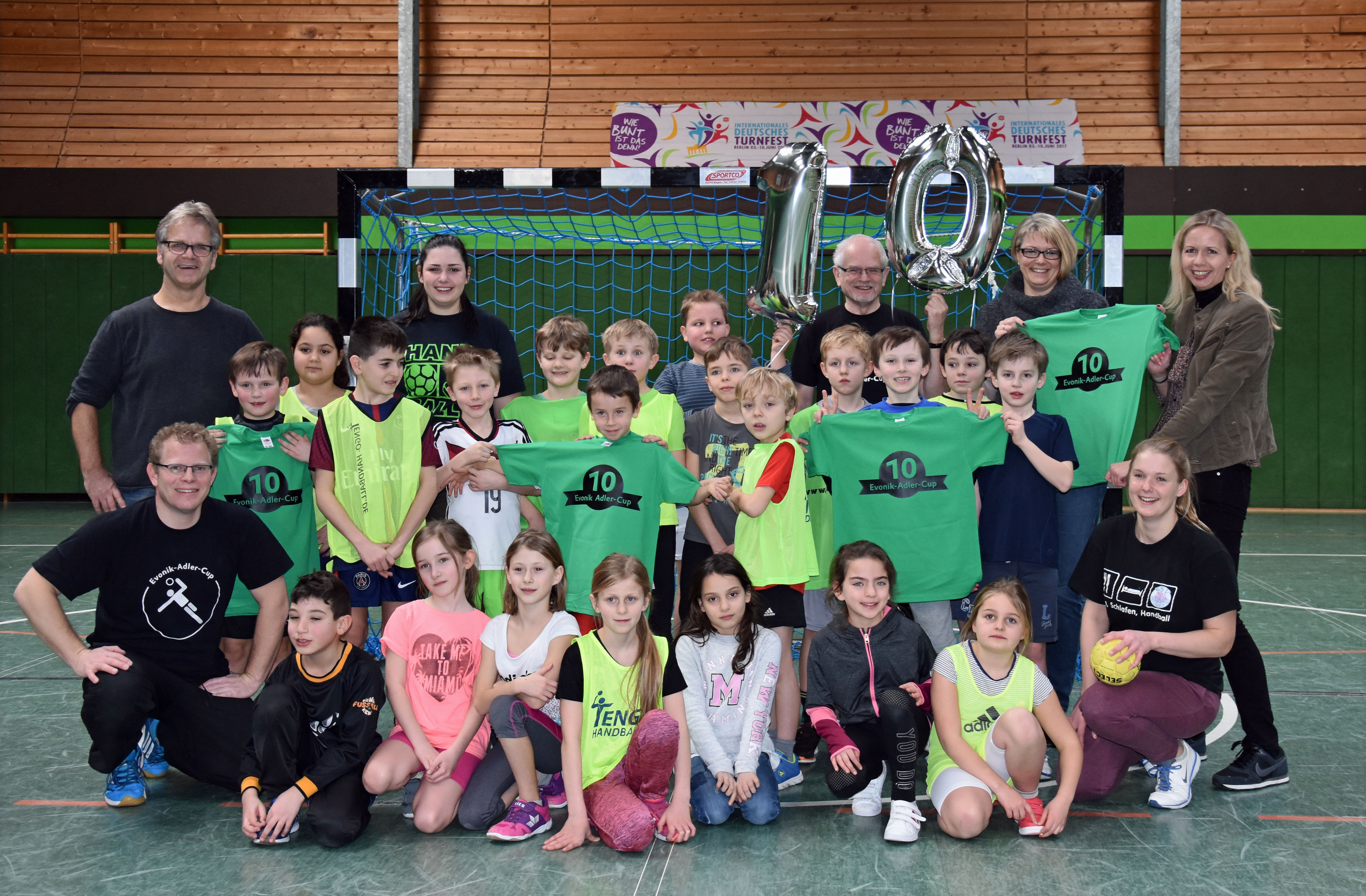 Seit Wochen trainieren die Drittklässler der teilnehmenden Grundschulen im Sportunterricht für den Evonik-Adler-Cup. Das Minihandballturnier findet am 5. März 2018 zum zehnten Mal statt. Ausgerichtet wird es vom Sportverein DJK Adler Königshof in Zusammenarbeit mit Evonik.