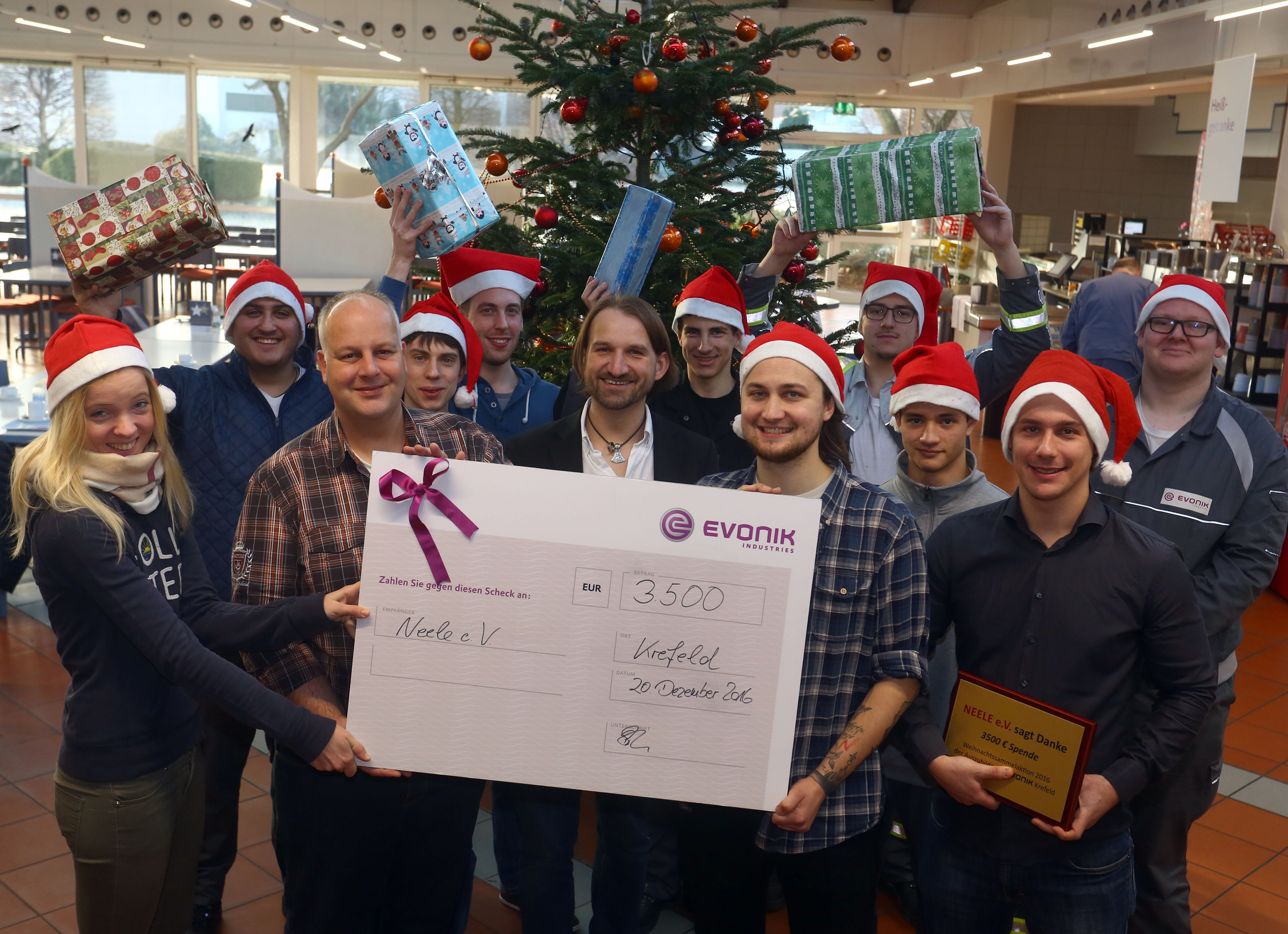 Heute überreichten Auszubildende des Evonik-Standorts Krefeld einen Scheck in Höhe von 3.500 Euro an Ralf Zanders und Jörg Taubert von Neele e.V. Rund 1.750 Euro stammen aus der traditionellen Weihnachtssammlung der Nachwuchskräfte am Standort, den übrigen Betrag übernahm die Standortleitung.