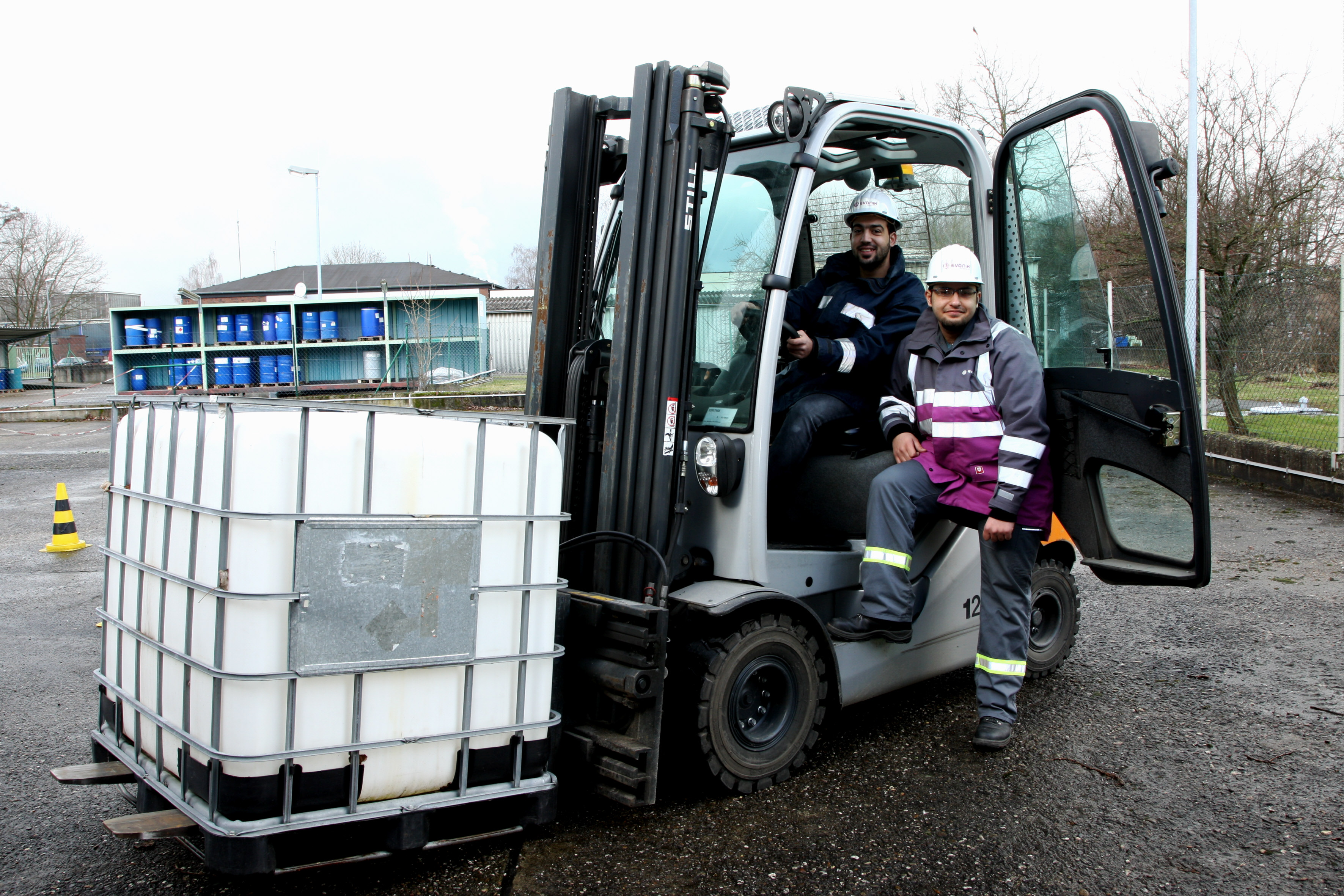 Für den Staplerführerschein erlernten Mohammad und Mohammad die notwendigen theoretischen und praktischen Grundlagen. „Die rechtlichen Grundsätze beim Staplerfahren sowie die Eigenschaften und physikalischen Grundlagen, wie Hebelgesetz und Fliehkräfte der verschiedenen Typen von Staplern, waren für die beiden neu“, erläuterte Matthias Dathe, Ausbilder für Flurförderfahrzeuge. „Wir sind besonders auf die Rechtsfolgen, wie zum Beispiel die persönliche Haftung, eingegangen, um ihnen Verantwortung im Umgang mit Staplern zu vermitteln.“ Dathe wurde hierbei von einer Dolmetscherin der Stadt Niederkassel unterstützt, die alle Schulungsinhalte und die anschließenden Prüfungsfragen ins Arabische übersetzte. Den abschließenden Praxistest, der unter anderem einen Testparcours und das Aufnehmen eines Containers beinhaltete, meisterten die beiden mit Bravour. Der erworbene Führerschein bedeutet schon jetzt einen großen Vorteil für einen der beiden Flüchtlinge, da er im Zuge von „Start in den Beruf“ das Magazin am Standort Lülsdorf kennen lernt und nun täglich den Stapler nutzen kann.