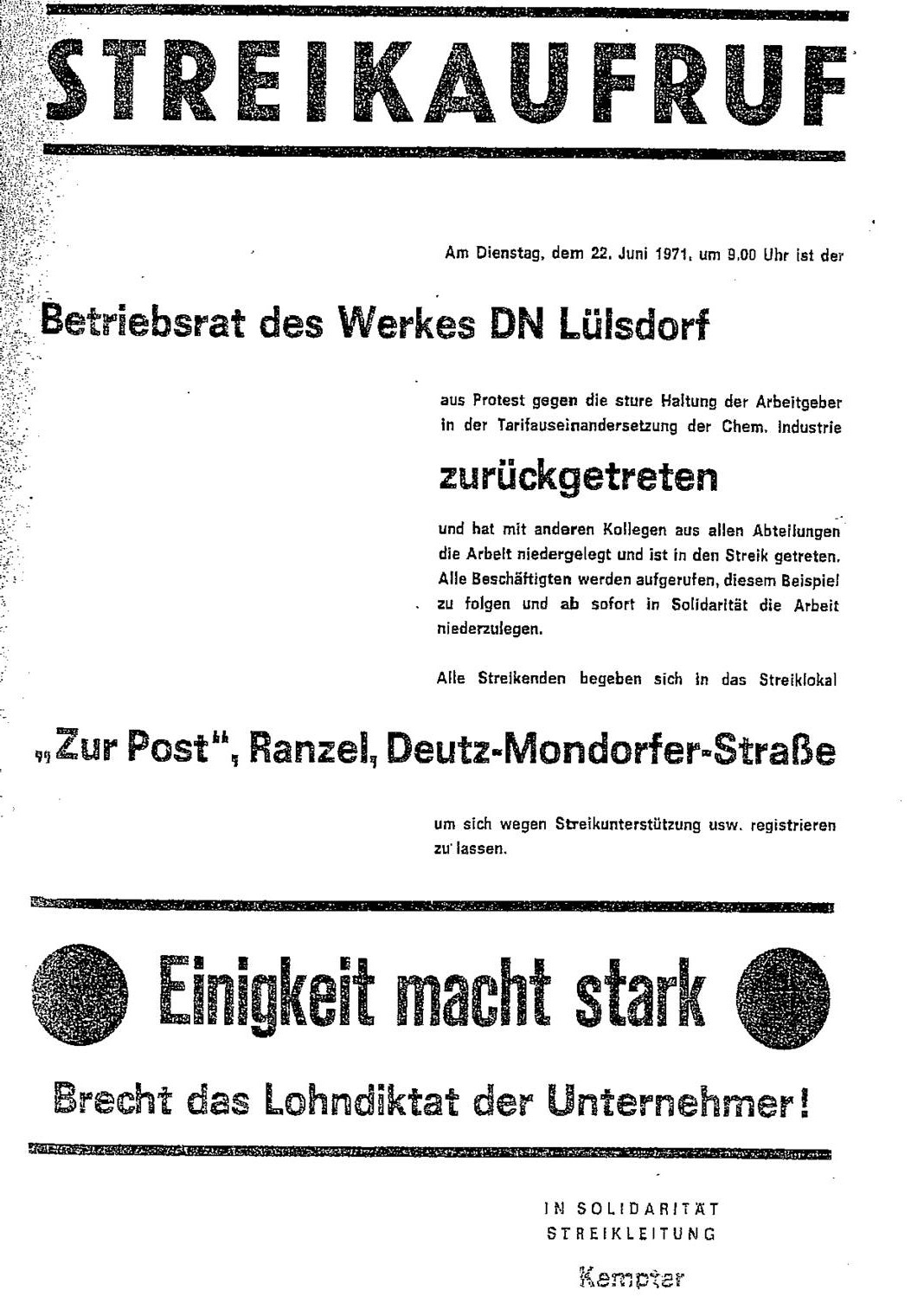 Aufgrund der Haltung der Arbeitgeber in der Tarifauseinandersetzung der Chemischen Industrie, trat am 22. Juni 1971 der Betriebsrat des Werks Lülsdorf aus Protest geschlossen zurück. Bundesweit gab es zu dieser Zeit viele Bummel-, Kurz-, Voll- oder Sitzstreiks. Auch in Hanau- Wolfgang, heute der zweitgrößte Standort von Evonik, verlängerte die Belegschaft ihre Frühstückspause auf zwei Stunden.