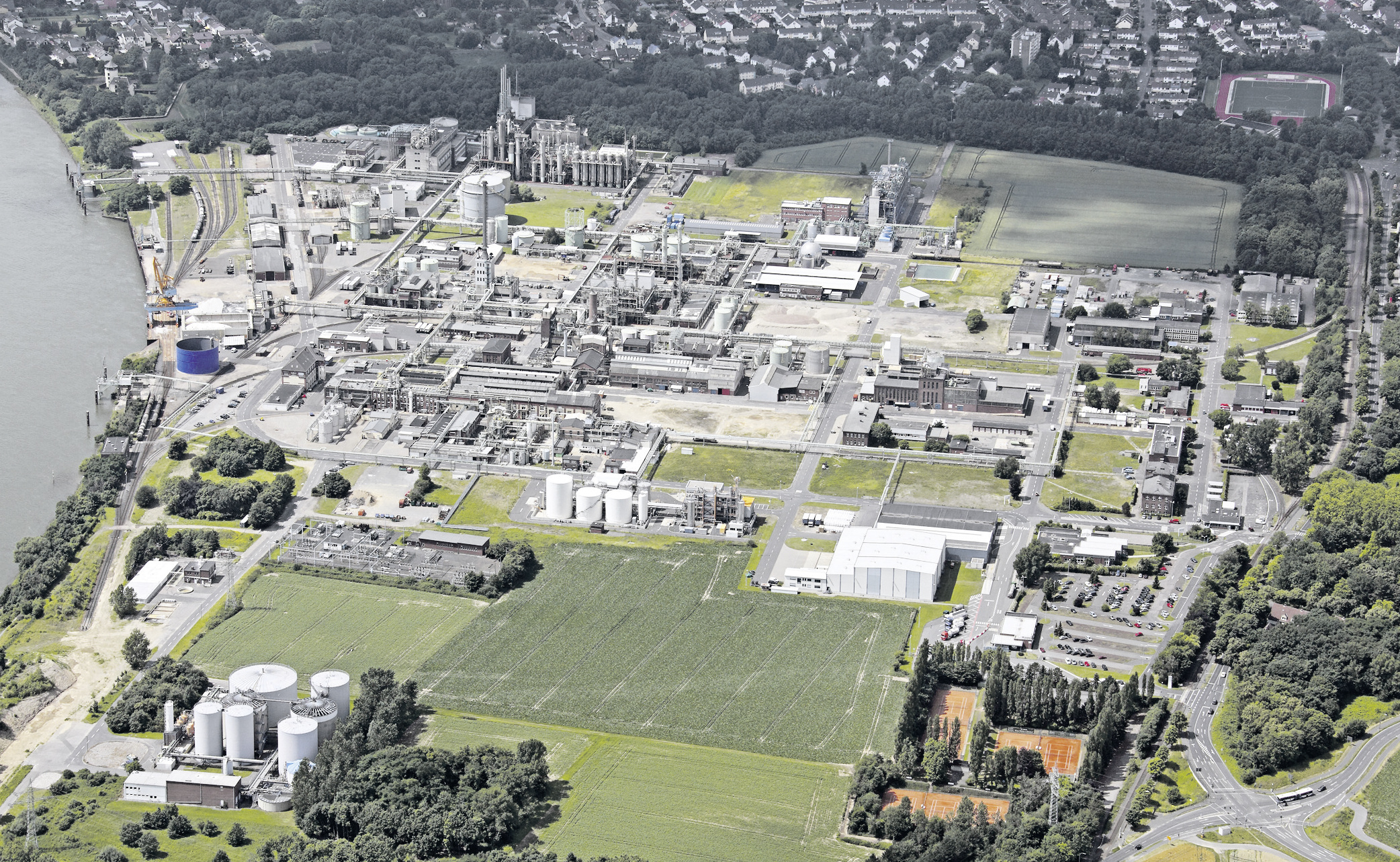 Zur Versorgung der Elektrolyse mit Methanol investierte Evonik in einen neuen Tank von bemerkenswerter Größe: Das Fassungsvermögen beträgt 15.000 m³, das entspricht mehr als 100.000 gefüllten Badewannen. Doch in den Wintermonaten 2008 brach die gesamte Produktion deutlich ein – die Wirtschaftskrise war nun endgültig am Standort angekommen. Die Elektrolyse und alle Folgebetriebe drosselten den Anlagenbetrieb auf ein Minimum. Nach dem Jahreswechsel folgten einige weitere schlechte Monate, in denen alle Mitarbeiter außerhalb der Produktionsbetriebe in Kurzarbeit arbeiteten. Der Sommer 2009 brachte jedoch den endlich erhofften Aufschwung, und zwar durch das Biodieselgeschäft: Wie schon einige Jahre zuvor (Teil 20 unserer Serie) verschaffte die steigende Nachfrage nach Biodiesel dem Standort einen erhöhten Absatz von Alkoholaten. Das Jahr 2011 war von organisatorischen Veränderungen geprägt. Das Chemiewerk Lülsdorf legte alle Standortfunktionen mit denen des Standorts Wesseling zusammen. Und wieder einmal änderte sich in der einhundertjährigen Geschichte der Name des Lülsdorfer Werks: Das „Degussa“ wurde aus dem Namen entfernt und der Standort nun direkt der Muttergesellschaft Evonik Industries AG zugeordnet. Evonik ist endgültig in Lülsdorf angekommen.
