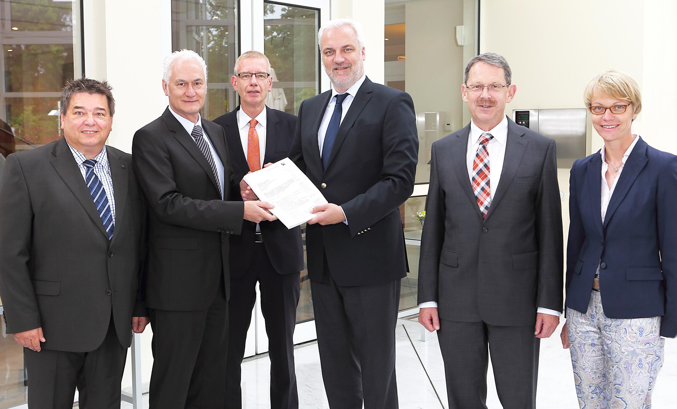 Zur freundlichen Geldübernahme stallten sich Bürgermeister Werner Arndt, Bernd Groß, Geschäftsführer WiN Emscher-Lippe GmbH, Peter Schnepper, leitender Geschäftsführer IHK Nord Westfalen, Wirtschaftsminister Garrelt Duin, Evonik Standortleiter Prof. Dr. Walter Tötsch und Regierungsvizepräsidentin Dorothee Feller.
