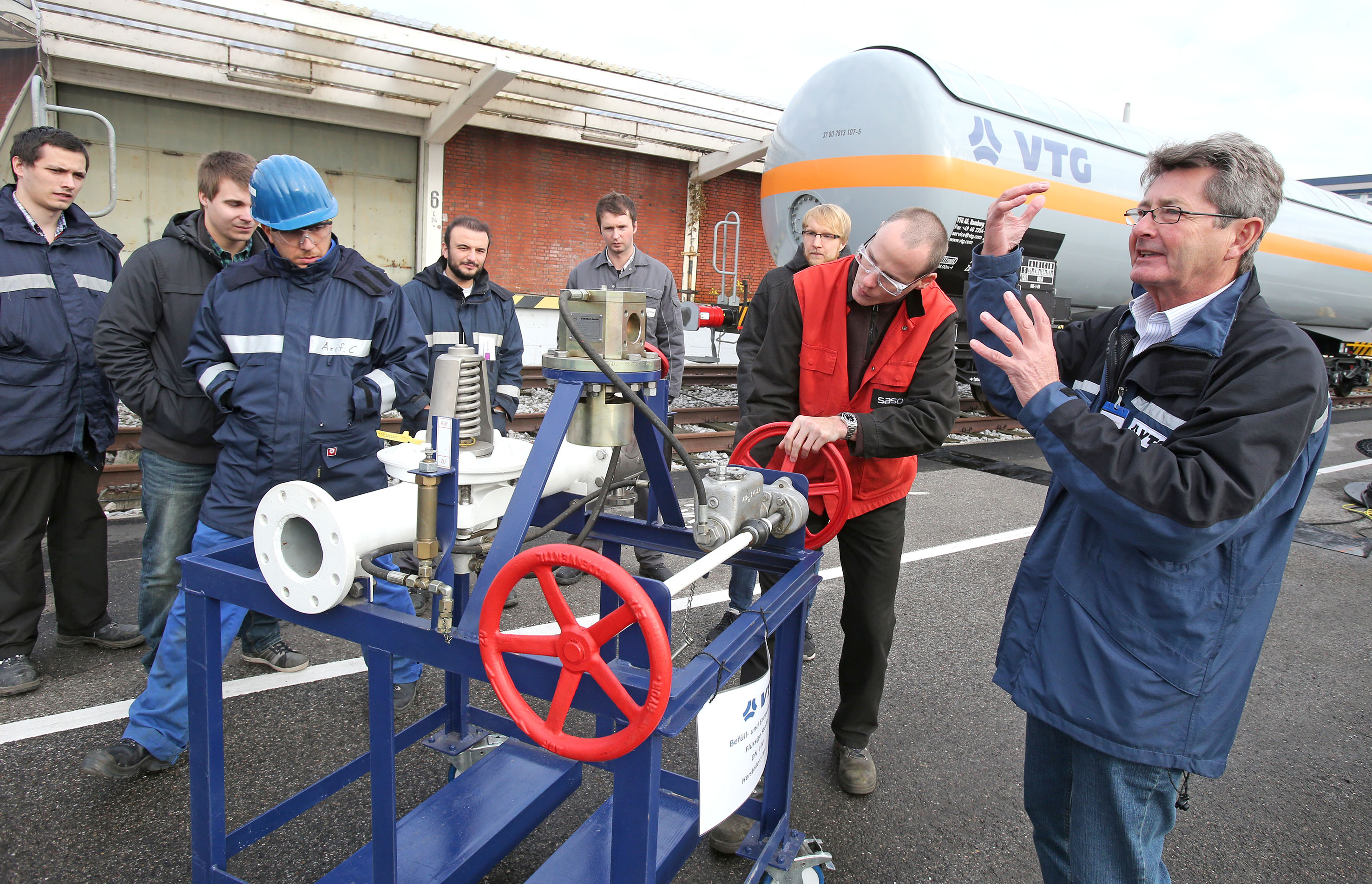 „Die Themen waren allumfassend“, erläutert Roland Neureiter, Referent der Logistiksicherheit. „Von den Pflichten für den Befüller und Entleerer über das Arbeiten an Ventilen, Kupplungen und Dichtungen bis hin zu theoretischen Beispielen und praktischen Übungen an Wagen und Tankcontainern sowie an Armaturenmodellen ging es um mögliche Leckagen und Störungen verbunden mit geeigneten Sicherheitsmaßnahmen bei möglichen Zwischenfällen oder Störungen.“