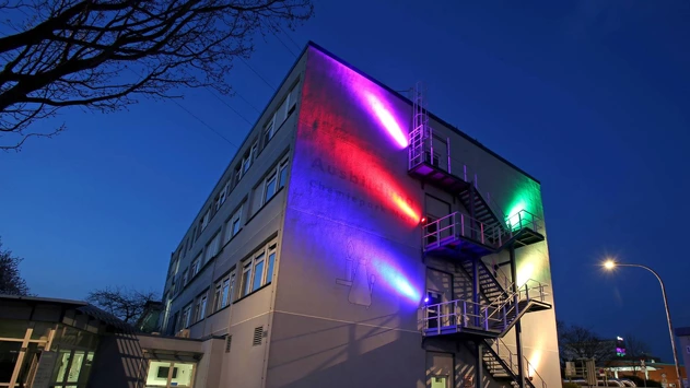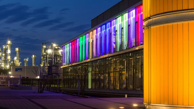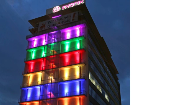 Gebäude, die innerhalb der letzten Jahre beleuchtet wurden und auch dieses Jahr wieder ein buntes Zeichen setzen: Die Evonik Creavis GmbH.