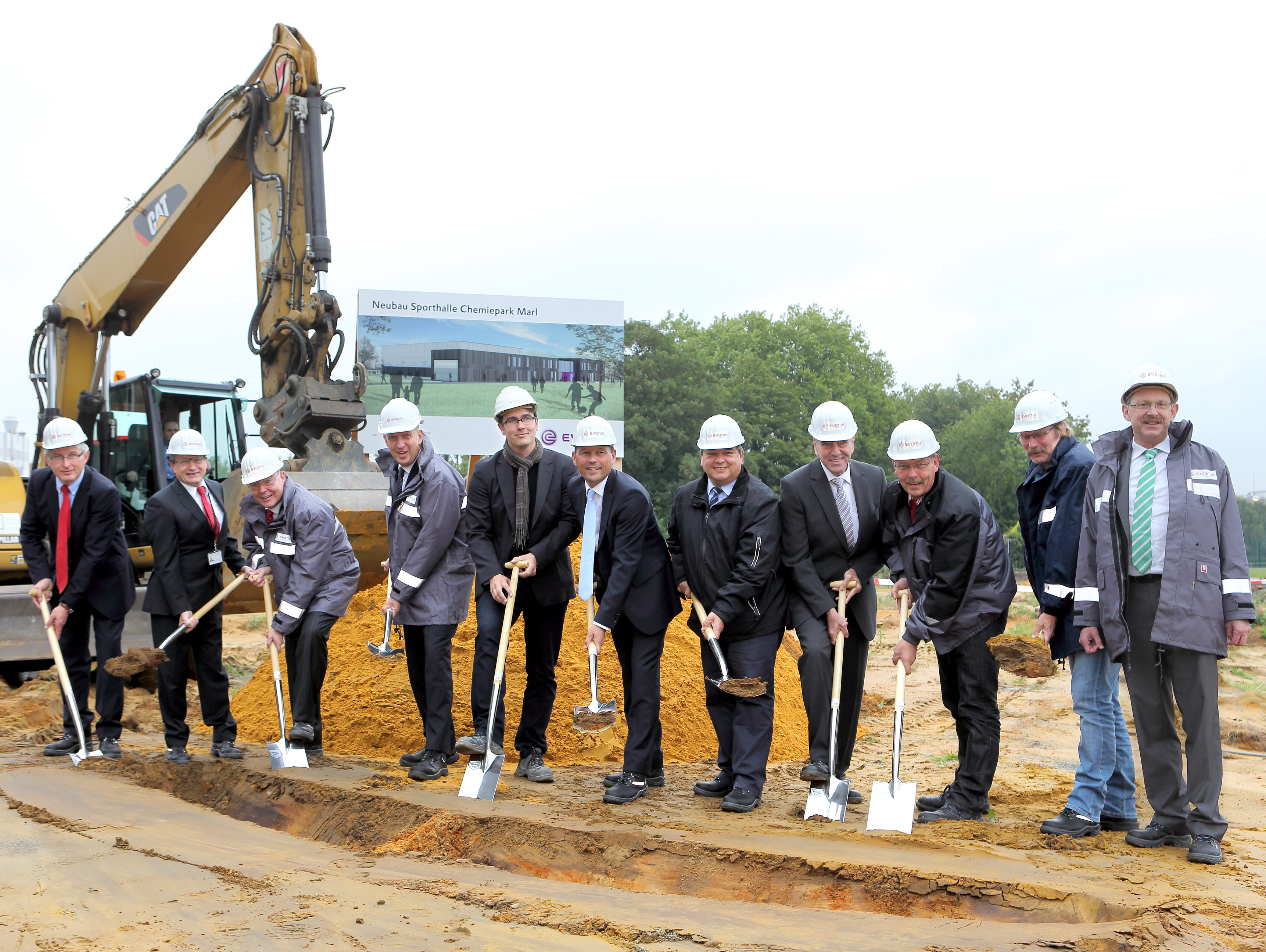 Auf der Baustelle traten an: Sprecherausschussvorsitzender Dr. Wilfried Robers, Dieter Rehage, Leiter Mitarbeiterservices, Dr. Hermann-Josef Korte, Leiter Ver- und Entsorgung, Caspar Gammelin, Leiter Geschäftsbereich Site Services, Architekt Professor Dr.-Ing. Bert Bielefeld, Thomas Wessel, Arbeitsdirektor und Personalvorstand, Bürgermeister Werner Arndt, Wolfgang Gerhardus, Leiter Bau-Planung, Dieter Peters, Betriebsratsvorsitzender Gemeinschaftsbetrieb Marl, Gesamtbetriebsratsvorsitzender Ralf Hermann und Standortleiter Professor Dr. Walter Tötsch.