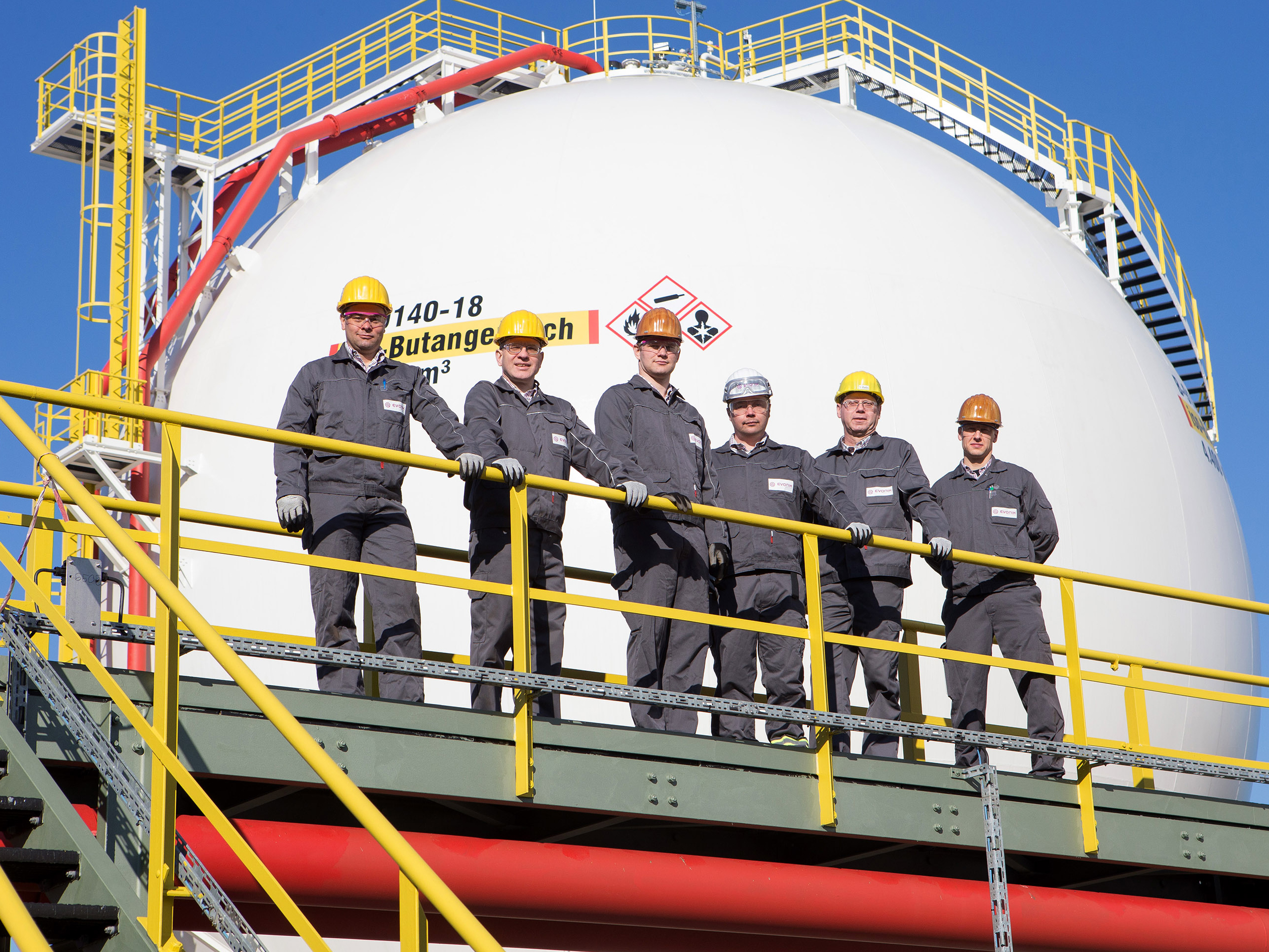 Geprüft und für gut befunden: Die Betreiberprüfstelle der Technischen Anlagensicherheit von Evonik zertifizierte die Kugel 18 – ein Druckgerät – im Hafentanklager des Chemieparks. Nach der Notifizierung dürfen die Marler das auch tun, wenn die neue Druckgeräterichtlinie in Kraft tritt. Zum Kern-eam zählen Björn Korczikowski, Stefan Kirsch, Nils Springer, Jens Winkelmann, Heinrich Vilain und Nils Lücking (von links).