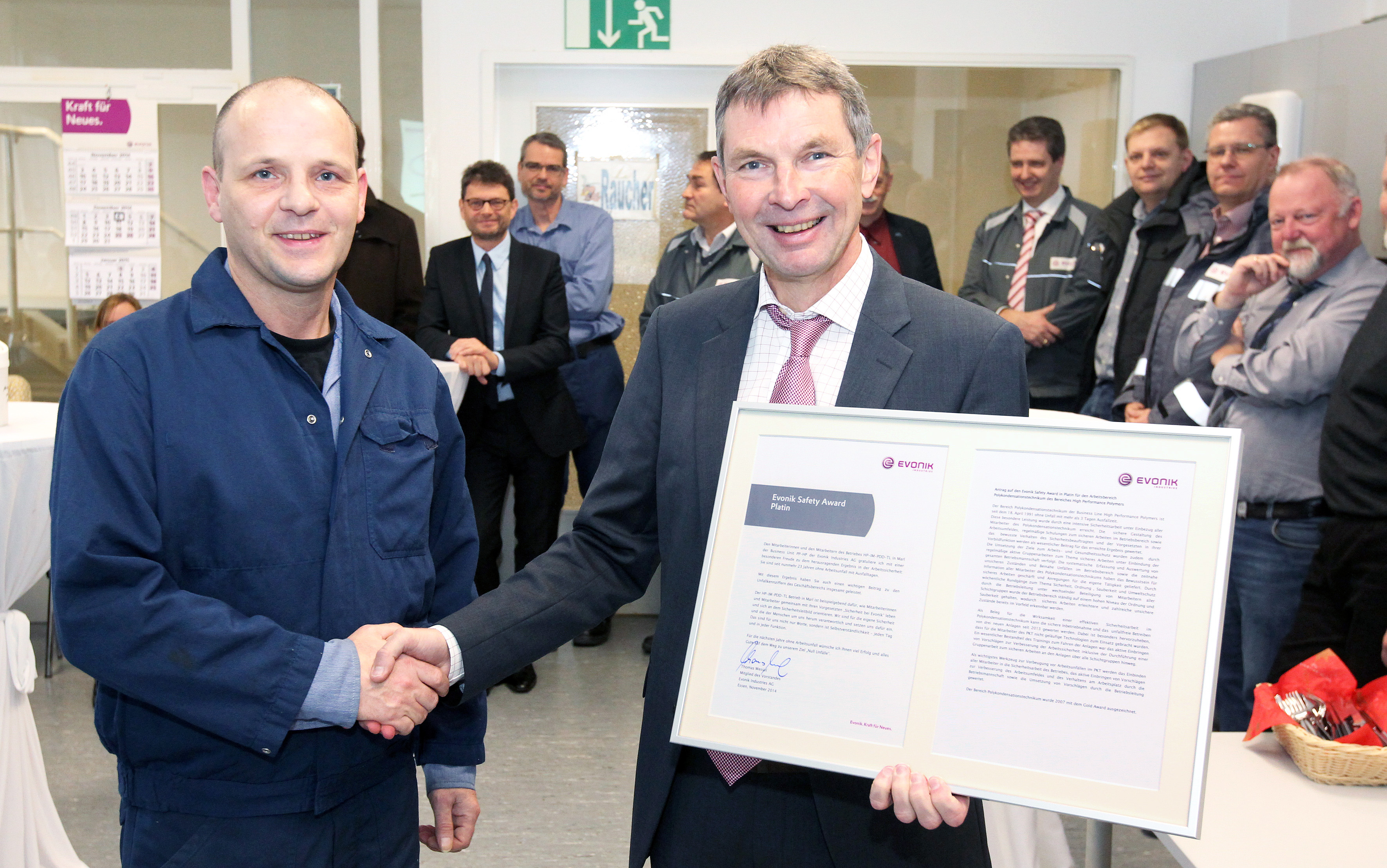 Die verdiente Auszeichnung dafür, den Evonik-Safety Award in Platin, nahm Tagschichtmeister und Sicherheitsbeauftragter Heinz-Georg Fitzlaff von Dr. Rainer Kohlen entgegen. „Hier zeigt sich, dass unser Sicherheitsleitbild wirklich gelebt wird“, stellte der Leiter Arbeits- und Anlagensicherheit im Bereich Corporate Environment & Responsibility fest.
