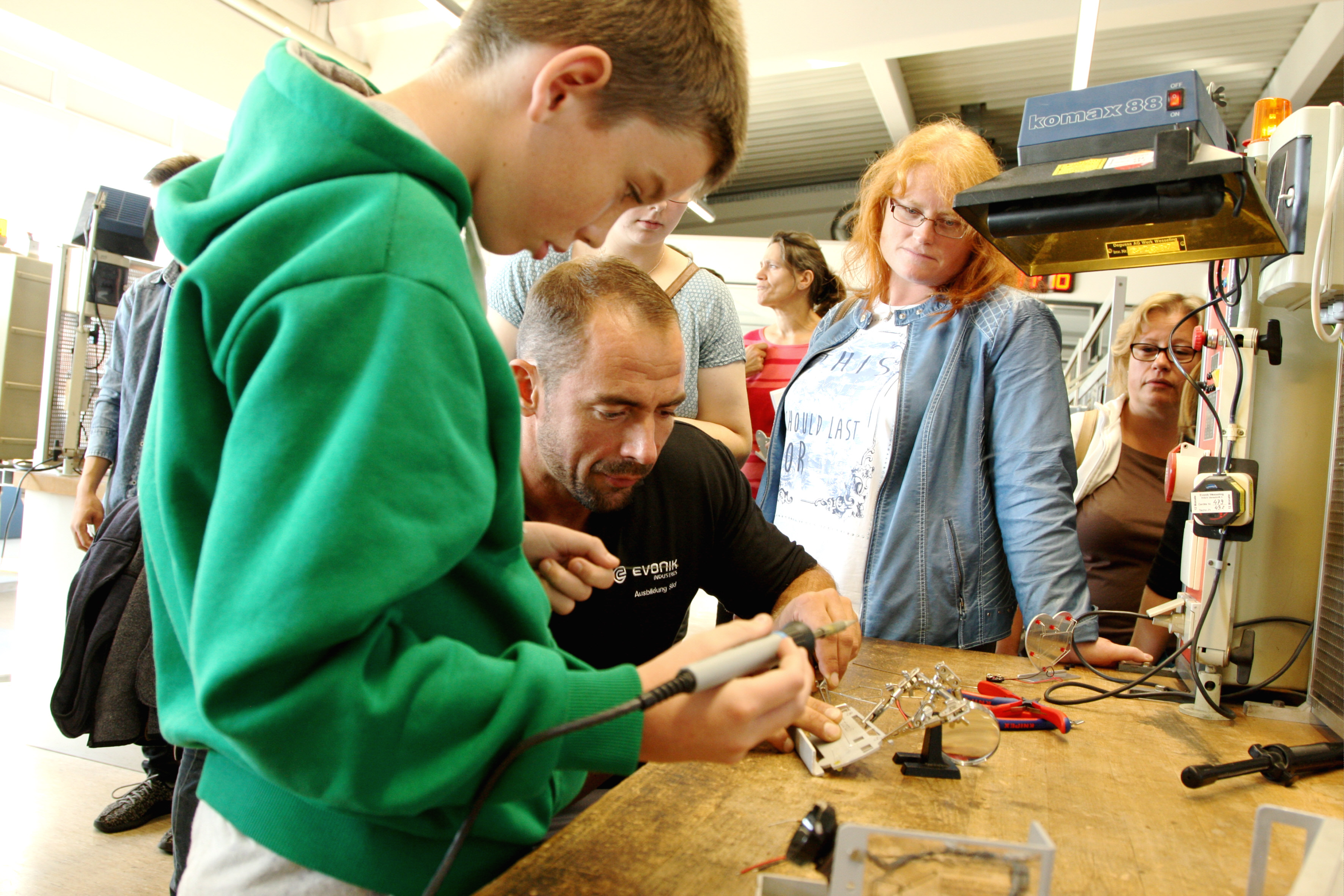 An den einzelnen Stationen der verschiedenen Ausbildungsberufe konnten die Besucher selbst praktisch anpacken. So durften sie unter fachkundiger Anleitung der Azubis beispielsweise im Metallbereich der Ausbildung bohren, senken und feilen und bei den Elektronikern sogar löten. Die illuminierten Werkstücke in Form eines Feuerwehrautos oder Herzens konnten die Besucher als Andenken mit nach Hause nehmen. Im Labor- und Technikumsbereich der Chemikanten und Laboranten wurde präparativ gearbeitet sowie destilliert, extrahiert und titriert.