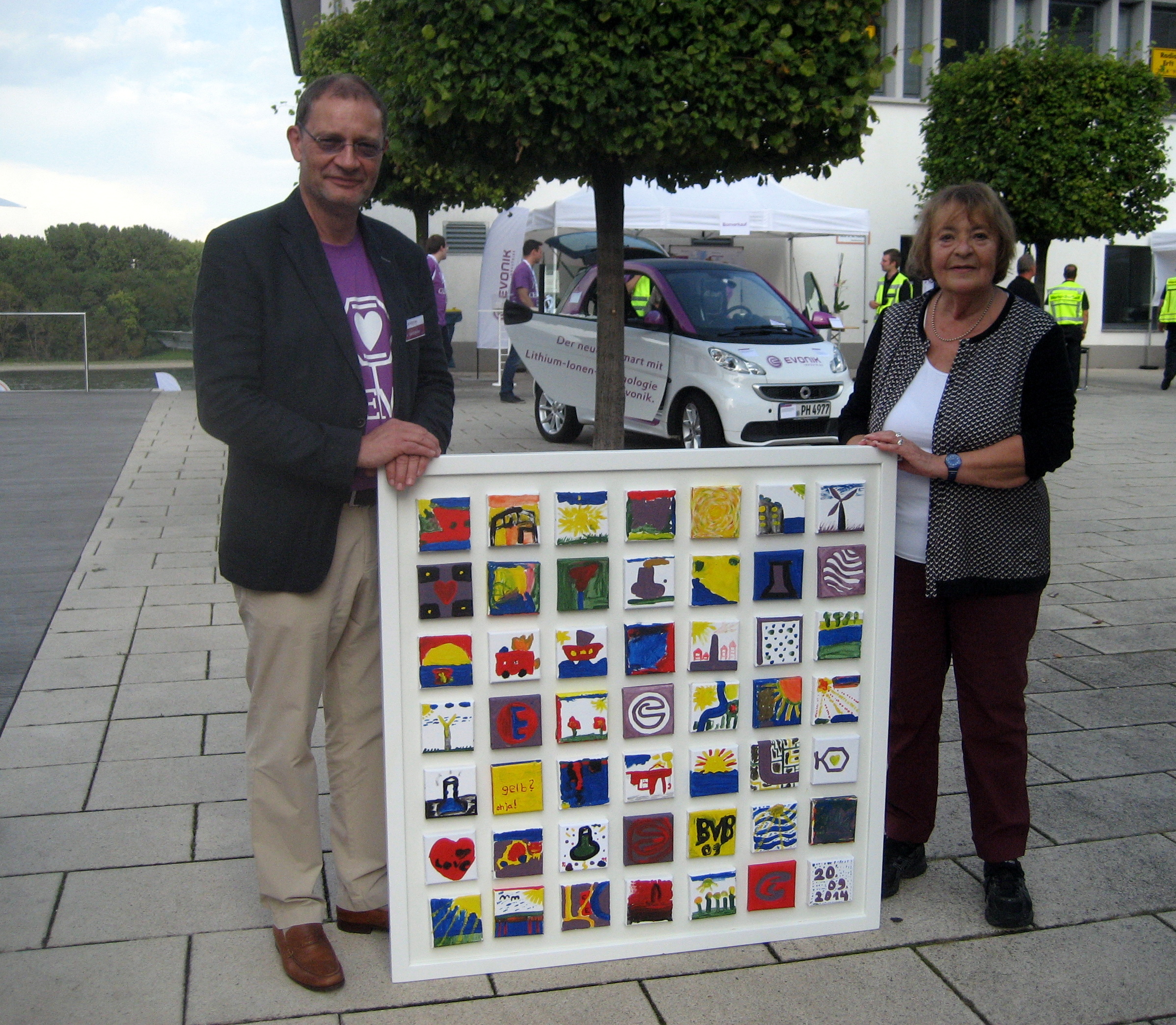 Aufgrund der tollen Resonanz beim Tag der offenen Tür 2011 organisierte Dagmar Ueding, Vorsitzende des Kunstvereins Wesseling e. V., auch bei der diesjährigen Veranstaltung am 20. September einen Stand, an dem die Kinder ihrer Phantasie zum Thema Chemie und Evonik wieder freien Lauf lassen konnten. Viele junge Künstler verewigten ihre Gedanken auf kleinen Leinwänden, die im Anschluss zu einem großen Kunstwerk zusammengefügt wurden. Nun schmückt ein neues Bild das Büro des Standortleiters.
