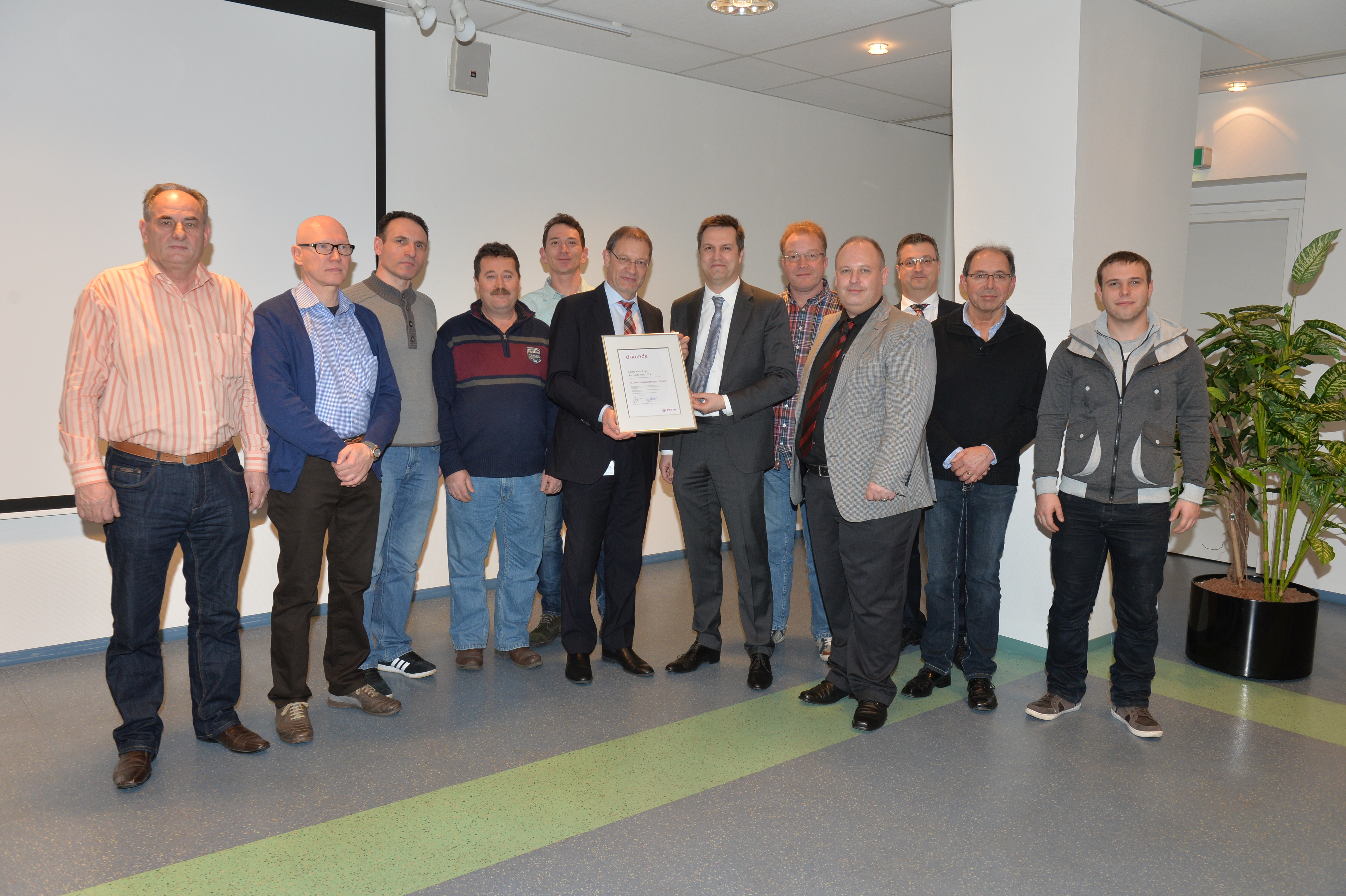Im Rahmen einer kleinen Feierstunde überreichten Standortleiter Dr. Gerd Wolter und Patrick Muhlack, Leiter des Technischen Services am Standort Wesseling, eine Urkunde an Werner Kessel, Geschäftsführer der Firma IIG Industrieisolierungen GmbH.