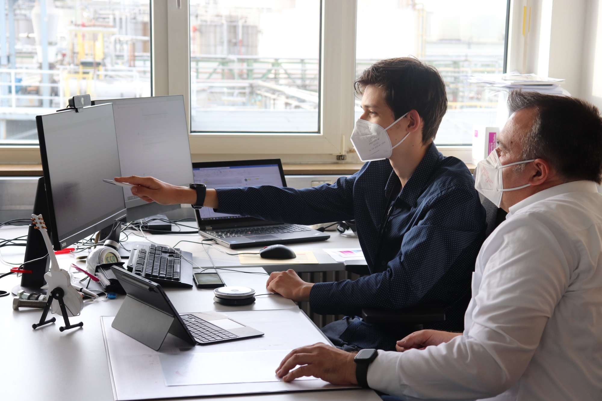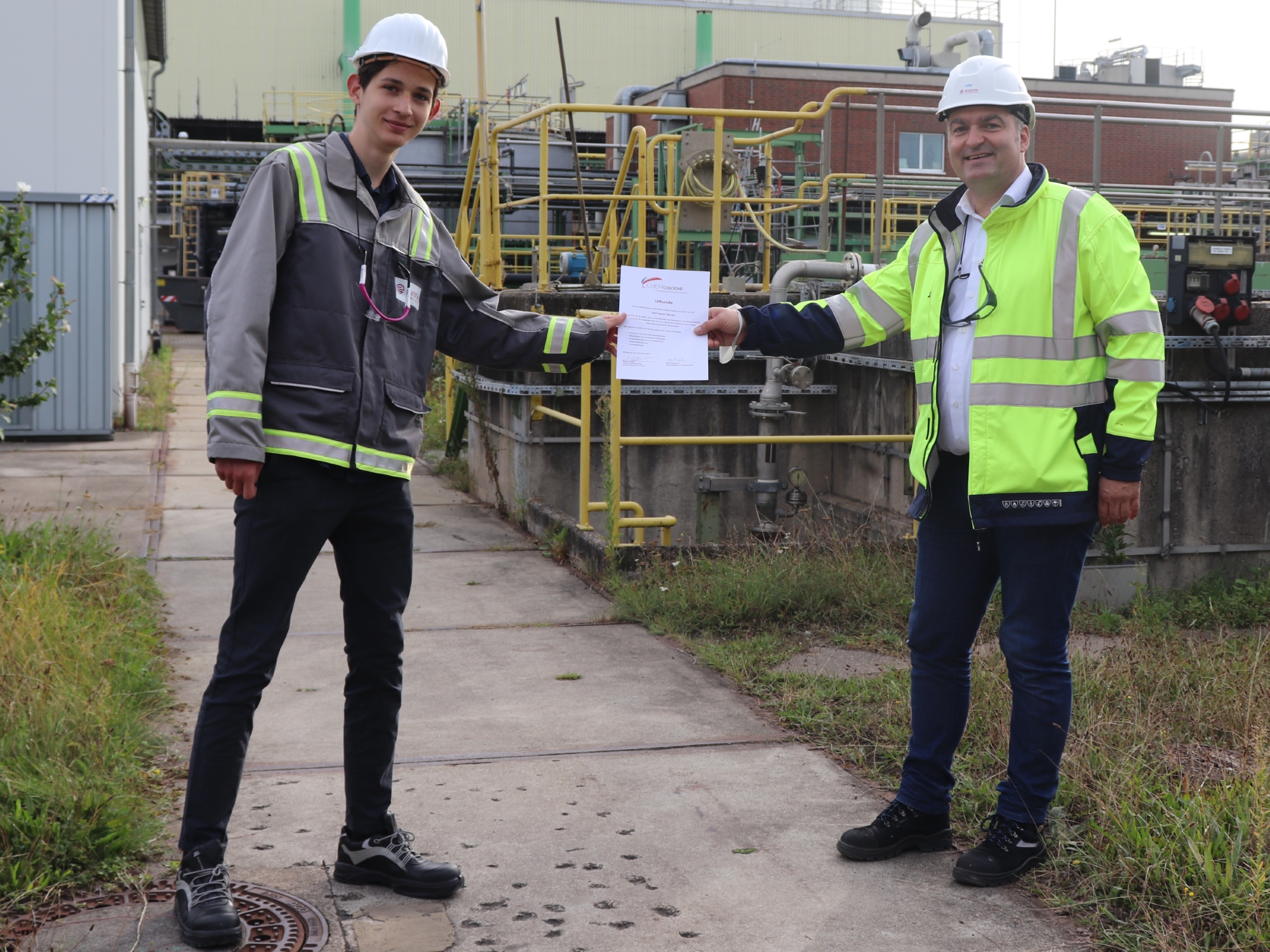 Der Kölner Schulabsolvent Aaron Wendt erhielt Ende September spannende Einblicke in den Tagesablauf eines Betriebsleiters der chemischen Industrie. Im Rahmen der ChemCologne-Aktion „Meine Position ist spitze!“ übernahm der ehemalige Schüler der St. George’s School in Köln den Chefposten der Umweltbetriebe am Standort Wesseling. Evonik-Mitarbeiter Marcus Killat hat seine Stelle dafür gerne bereitgestellt. „Durch den Aktionstag kann ich nicht nur einen jungen Menschen bei der Zukunftsplanung unterstützen, sondern auch mir selbst über die Schulter schauen und ein Feedback zu meiner Arbeit geben“, so der Leiter der Umweltbetriebe.