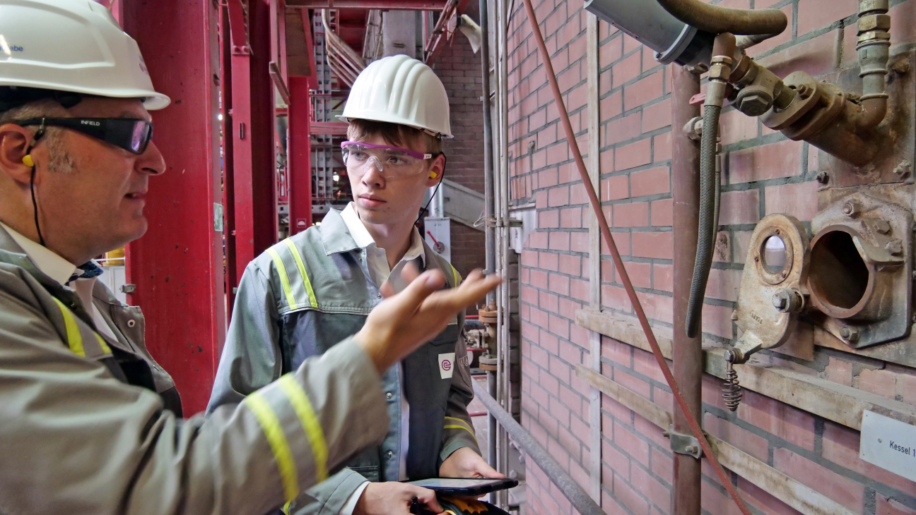 Mit hohen Erwartungen startete der 17-Jährige seinen Arbeitstag bei Evonik. „Ich bin gespannt, wie ein Tag als Leiter einer Abteilung aussieht, wie das Abwasser des Standorts gemanagt wird und die verschiedenen Chemieanlagen mit Energie versorgt werden“, sagte Rohe. Nachdem er gemeinsam mit Killat eine Teambesprechung geleitet und seinen Tag strukturiert hatte, stand eine Sicherheitsbegehung des Kraftwerkes an. „Als Leiter der Ver- und Entsorgung bist du nicht nur dafür verantwortlich, dass die Betriebe am Standort Energie erhalten, sondern vor allen Dingen für die Sicherheit der Mitarbeiterinnen und Mitarbeiter“, erklärte Killat und übergab damit die Durchführung und Dokumentation der Begehung in Rohes Hände. Interessiert und aufmerksam ließ er sich während des Rundgangs die Funktionen des Kraftwerkes erklären, wies auf kleine Stolperfallen und Hindernisse hin und protokollierte diese gewissenhaft.