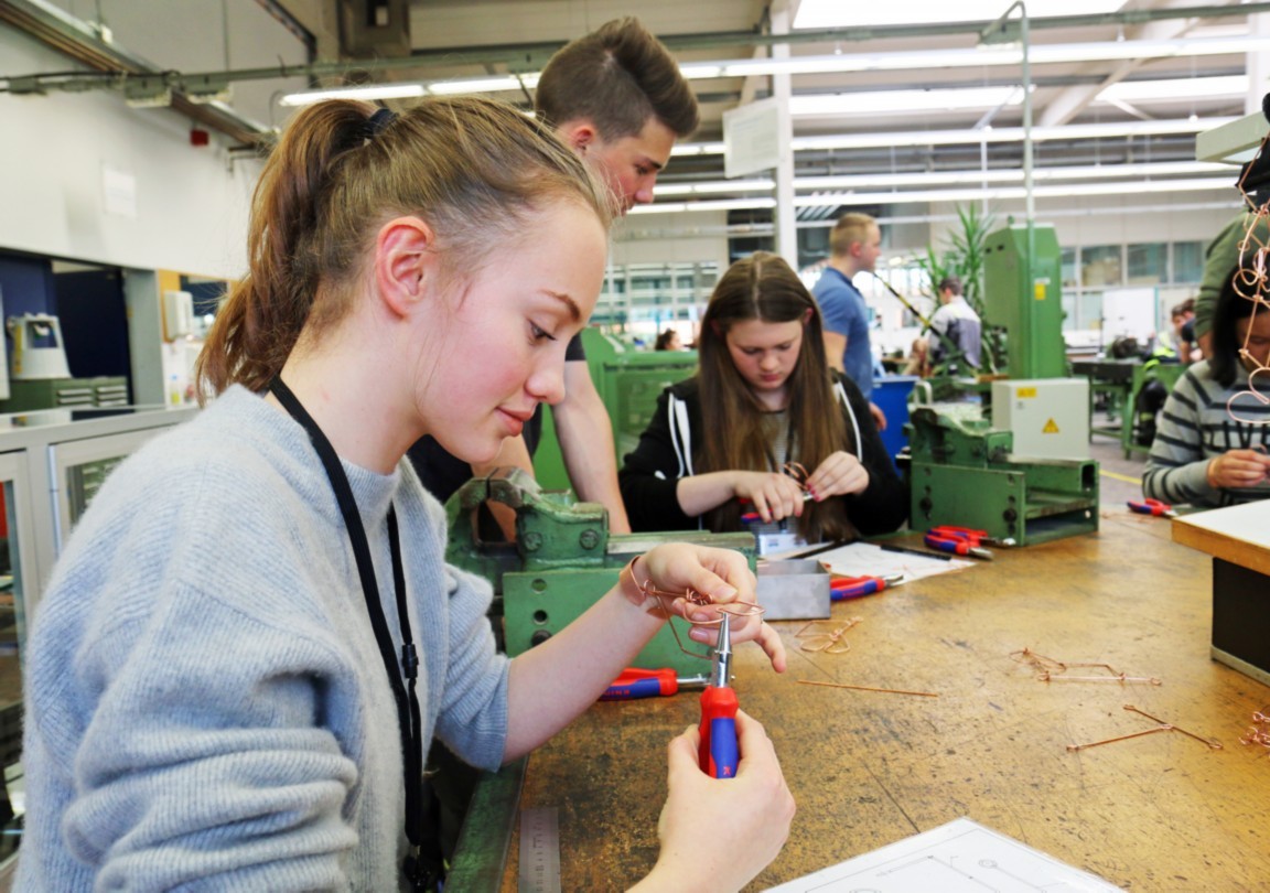 Anschließend ging es im Ausbildungszentrum des Industrieparks weiter. In den drei naturwissenschaftlich-technischen Ausbildungsbereichen Chemie, Metall und Elektro arbeiteten sie bis zum Feierabend an eigenen kleinen Aufgaben. In den Laboren und Technika der Chemielaboranten und Chemikanten experimentierten sie und lernten dabei verfahrenstechnische Grundlagen kennen. Mit Unterstützung der Azubis der Metallausbildung stellten sie ein Geduldspiel aus Kupferdraht sowie Armreifen aus Kupfer her, die sie stolz mit nach Hause nahmen. In der Elektroausbildung tüftelten sie erfolgreich an der Frage, wie man eine Blinkschaltung baut.