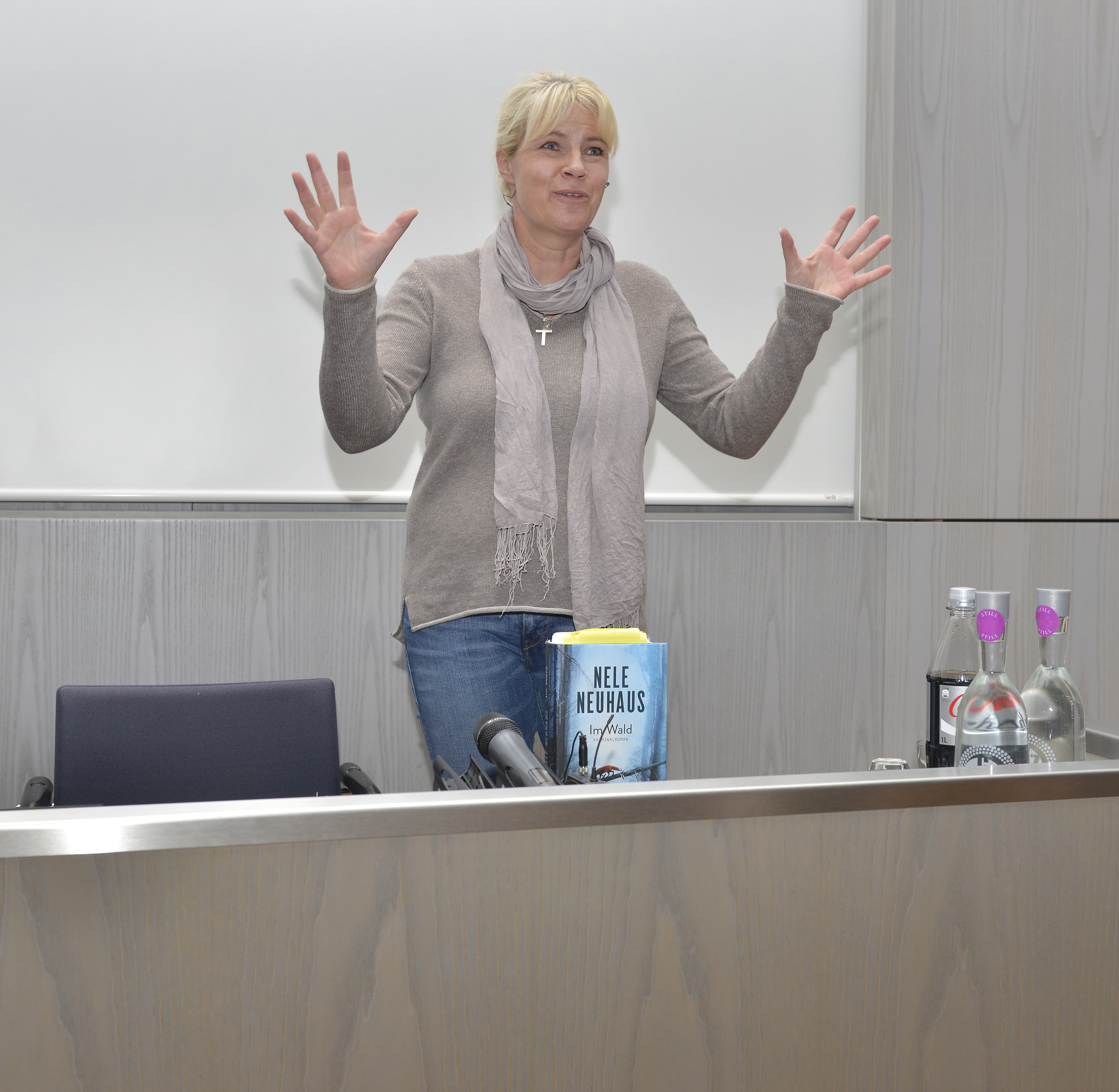 Nele Neuhaus schlug ihre Zuhörer schnell in ihren Bann: Sie erzählte zunächst sehr launig über den Recherche-Alltag einer Krimi-Autorin. „Wenn ich im Taunus unterwegs bin, fällt mir häufig die eine oder andere Stelle auf, wo gut eine Leiche liegen könnte.“ Anschließend widmete sie sich der Mordgeschichte im beschaulichen Taunusdorf.