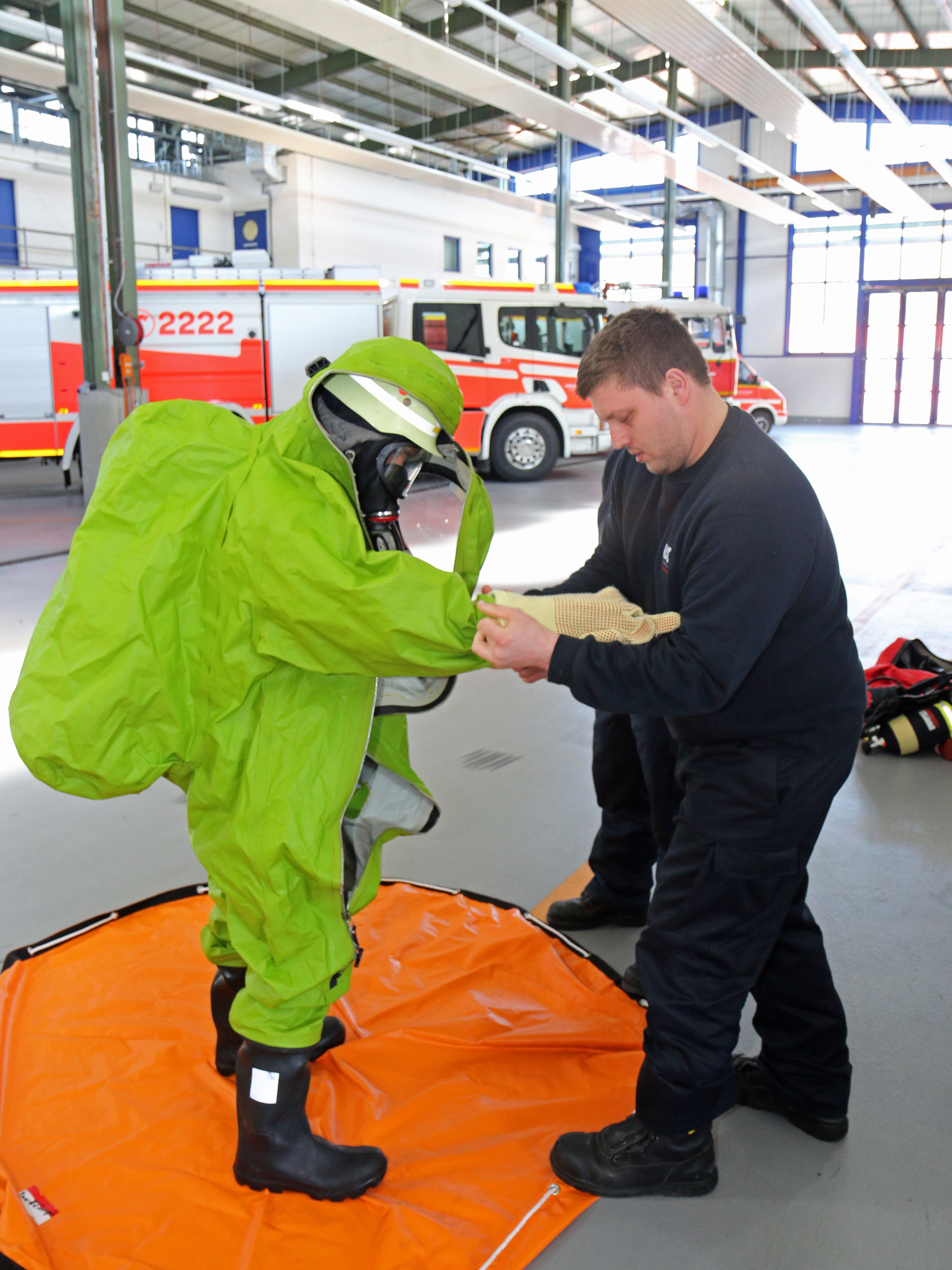 „Der Anzug bietet besonderen Schutz gegen chemische und biologische Stoffe und ist insbesondere für den Einsatz in Industrieunternehmen wichtig“, sagt Jens Hellmuth, Leiter der Werkfeuerwehr im Industriepark Wolfgang. Im Theorieunterricht erhielten die Teilnehmer Informationen über den Aufbau des Schutzanzuges sowie dessen Einsatzgrenzen.