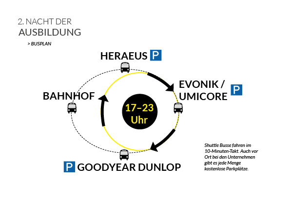 Ein Bus-Shuttle zwischen den einzelnen Unternehmen ist eingerichtet. Die Busse verkehren im 10-Minuten-Takt und fahren auch den Hanauer Hauptbahnhof an. Der Eintritt ist frei. Letzter Einlass ist um 22:30 Uhr. Bitte bringen Sie zum Einlass auf die Betriebsgelände Ihren Personalausweis mit.