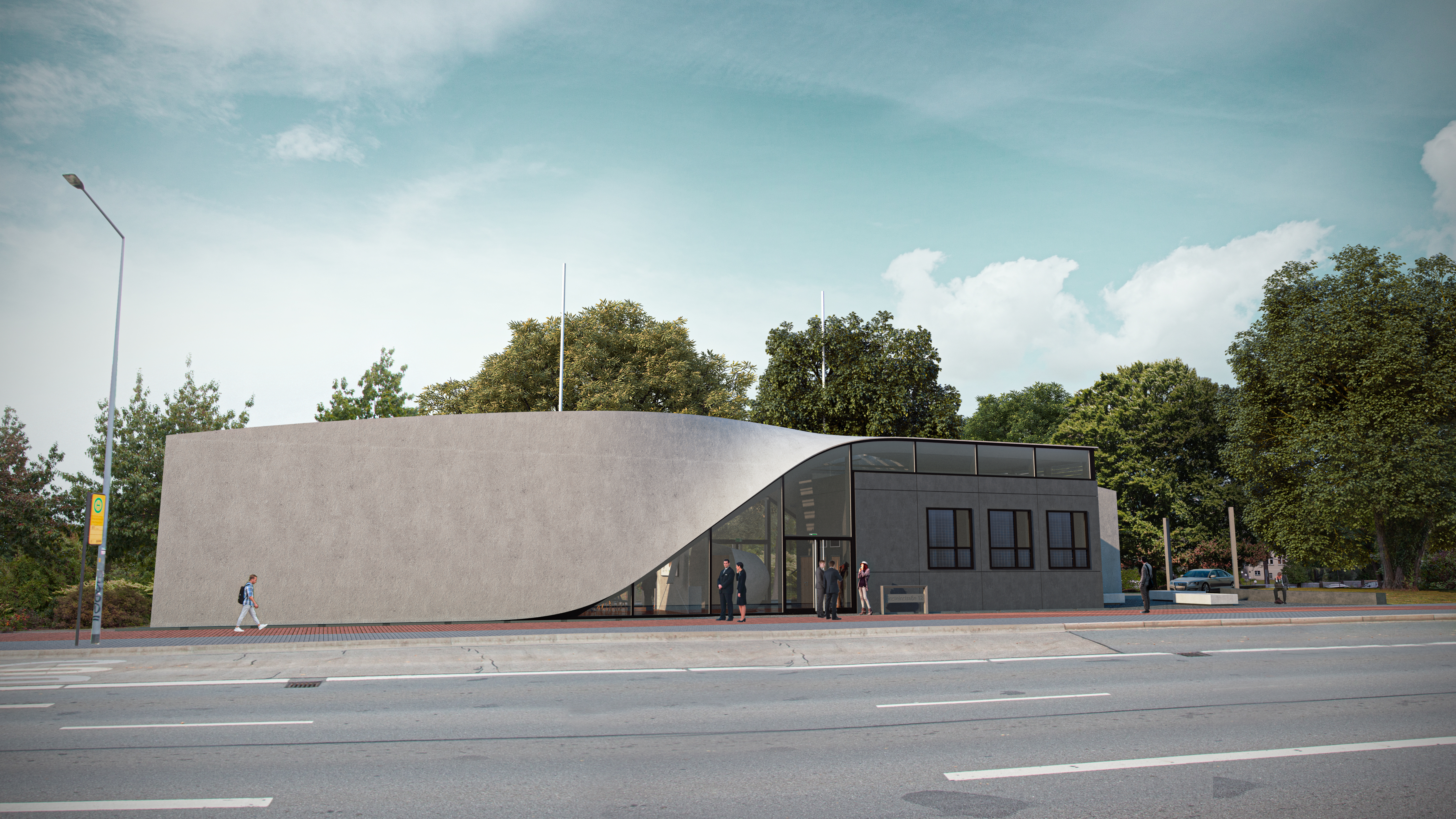 Rendering of the carbon reinforced concrete building CUBE showing the TWIST roof; Photo: Iurii Vakaliuk, TU Dresden, IMB