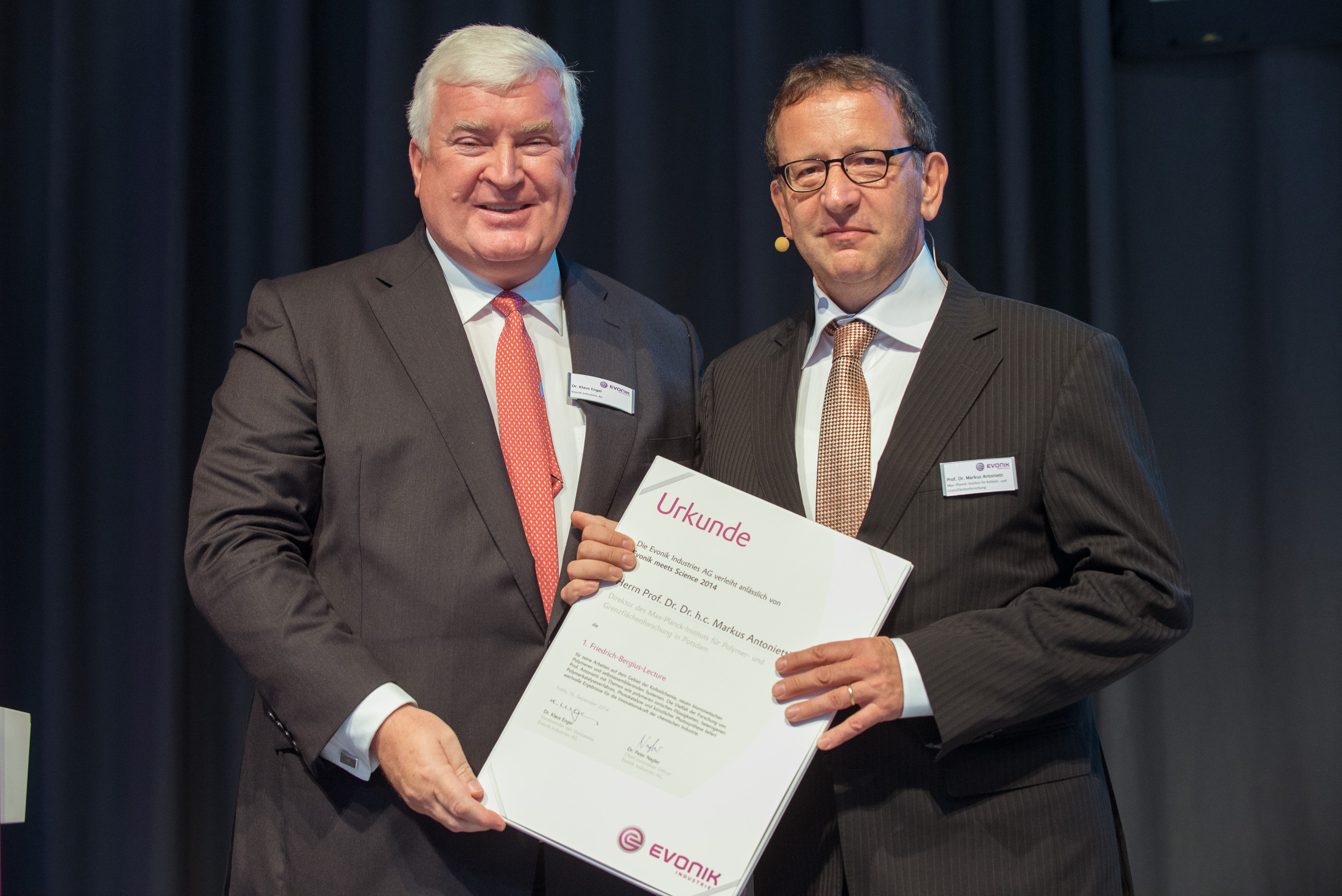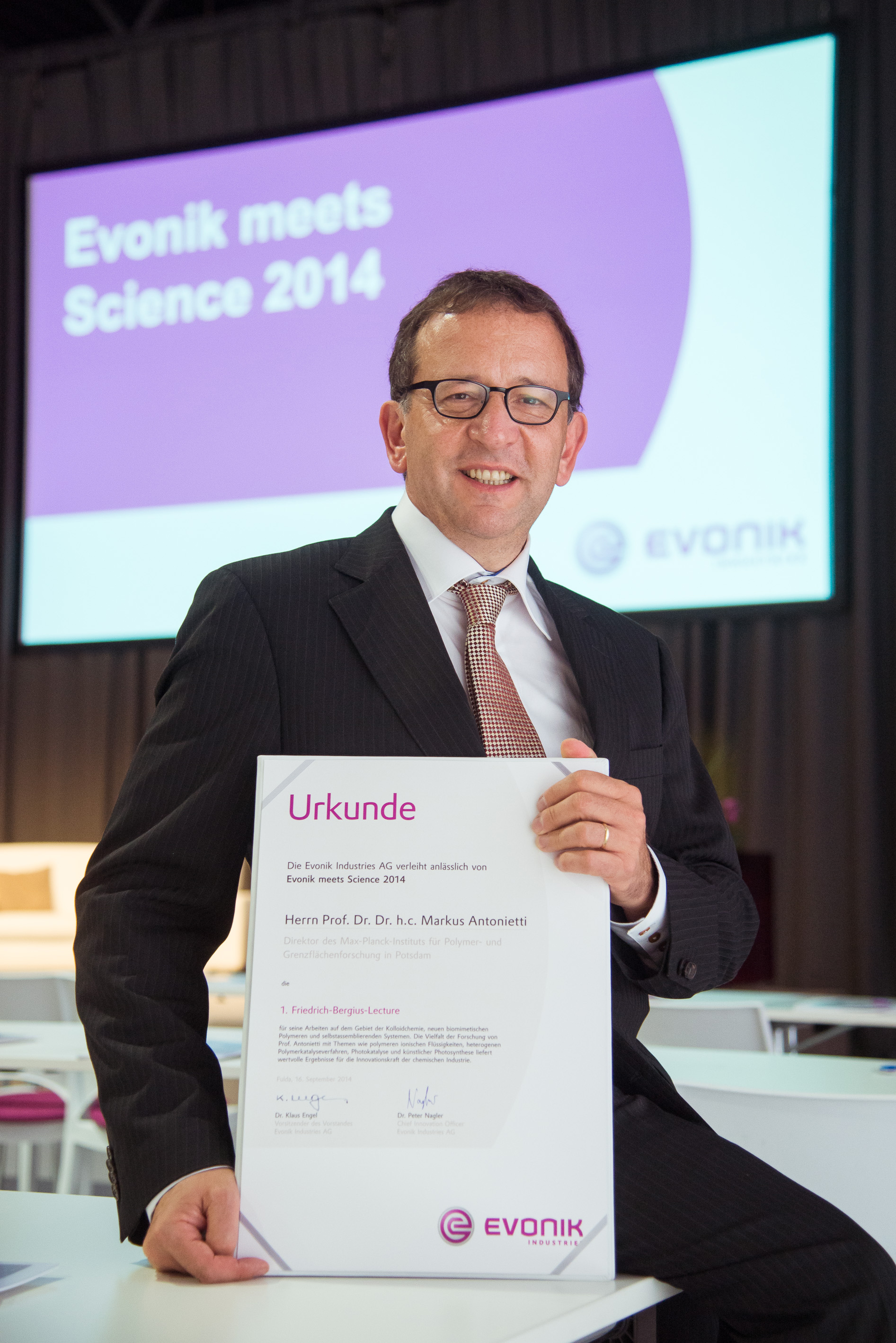 Evonik Industries, one of the leading global specialty chemicals companies, has announced its first-ever Friedrich Bergius Lecture award. For 2014 it went to Professor Dr. Markus Antonietti, the director at the Max Planck Institute of Colloids and Interfaces in Potsdam (Germany). With the lecture, Evonik gives outstanding scientists the opportunity to speak on scientifically relevant issues. In his speech, Antonietti gave an overview of his research on colloid and interface chemicals to some two hundred scientists from well-known German universities as well as Evonik researchers.
