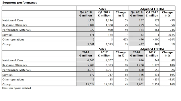 Resource Efficiency: Sales at the segment rose 6 percent to €5.71 billion in 2018. The main driver was higher selling prices, partly due to the passing on of higher raw-materials costs, and the inclusion of the silica business of J.M. Huber, acquired in September 2017. Demand for coating additives as well as for polyamide 12 from the auto and 3D-printing industries boosted sales at the segment. Adjusted EBITDA at Resource Efficiency increased 10 percent to €1.29 billion.