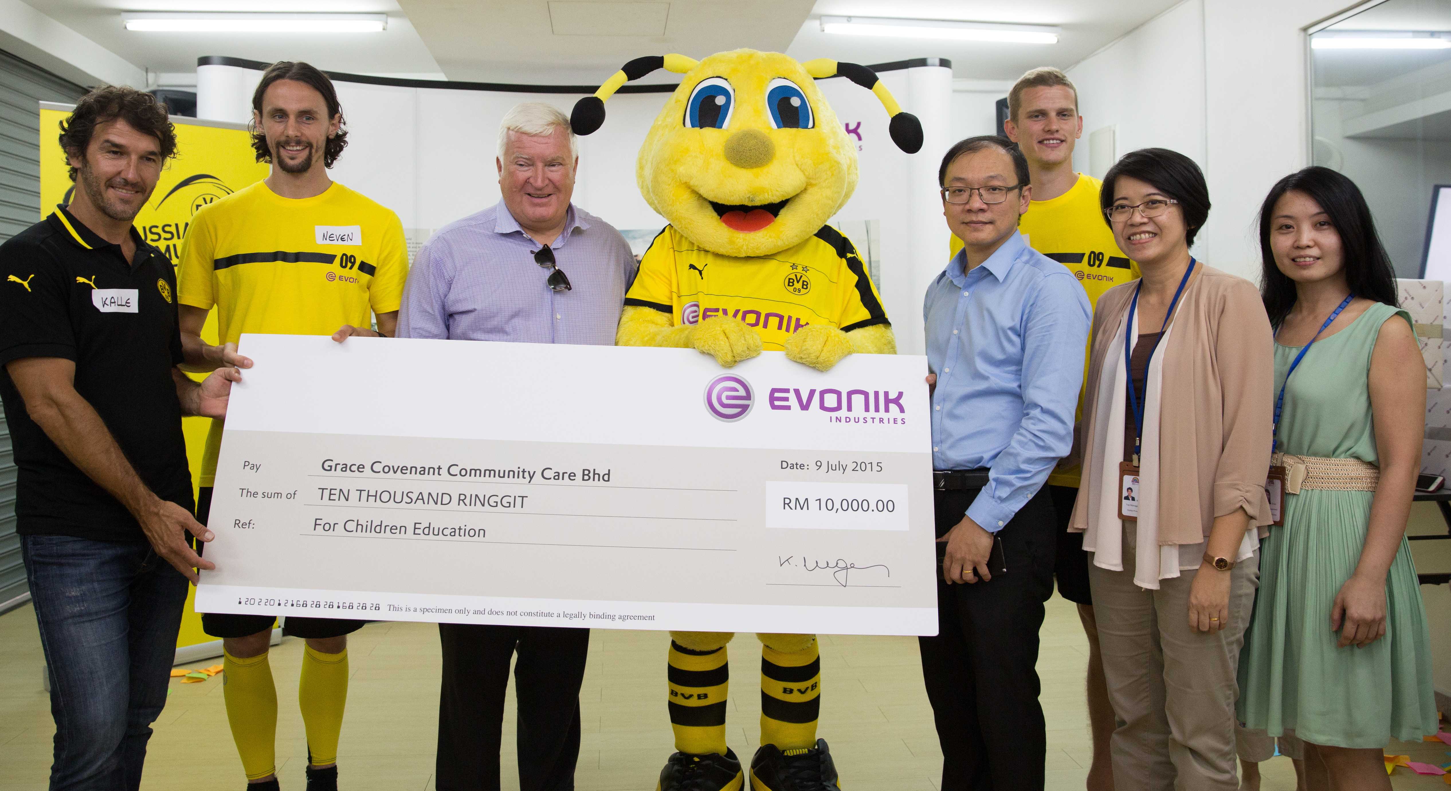 JOHOR BAHRU. To enlighten children’s interest in science, today Evonik brought a fun chemistry class to the Grace Covenant Community Care, a non-profit organization in Johor Bahru which provides shelter, education, care and protection to children with challenging backgrounds. In addition to presenting a ten thousand ringgit donation, Evonik invited players from its sponsored-Germany sports club, Borussia Dortmund (BVB) to bring cheer to the children in Grace Covenant.