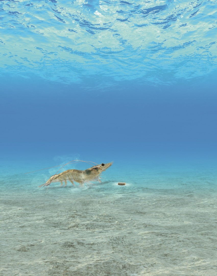 Now, after intensive research, there are plans to transfer this success to shrimp. The challenge here is that the feeding behavior and digestive systems of crustaceans like shrimp are entirely different from those of fish. Whereas salmon are predatory fish that snatch up their food the moment it enters the water, shrimp eat their food very slowly from the seabed. As a result, highly water-soluble components leach out of the feed pellets before the shrimp can eat them. In addition, the supplemented methionine has to be present at a certain time—right when amino acids become available from the protein digestion process.